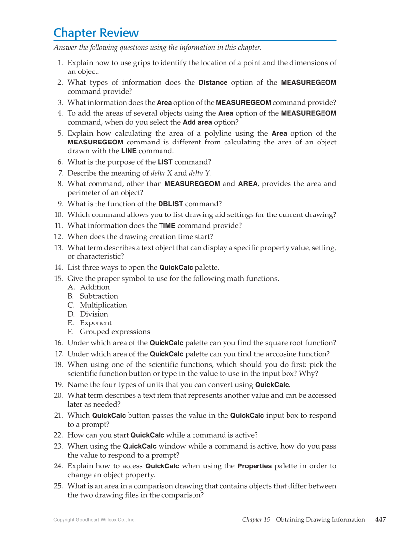 Chapter 15 Obtaining Drawing Information 447 Copyright Goodheart-Willcox Co., Inc. Chapter Review Answer the following questions using the information in this chapter. 1. Explain how to use grips to identify the location of a point and the dimensions of an object. 2. What types of information does the Distance option of the MEASUREGEOM command provide? 3. What information does the Area option of the MEASUREGEOM command provide? 4. To add the areas of several objects using the Area option of the MEASUREGEOM command, when do you select the Add area option? 5. Explain how calculating the area of a polyline using the Area option of the MEASUREGEOM command is different from calculating the area of an object drawn with the LINE command. 6. What is the purpose of the LIST command? 7. Describe the meaning of delta X and delta Y. 8. What command, other than MEASUREGEOM and AREA, provides the area and perimeter of an object? 9. What is the function of the DBLIST command? 10. Which command allows you to list drawing aid settings for the current drawing? 11. What information does the TIME command provide? 12. When does the drawing creation time start? 13. What term describes a text object that can display a specific property value, setting, or characteristic? 14. List three ways to open the QuickCalc palette. 15. Give the proper symbol to use for the following math functions. A. Addition B. Subtraction C. Multiplication D. Division E. Exponent F. Grouped expressions 16. Under which area of the QuickCalc palette can you find the square root function? 17. Under which area of the QuickCalc palette can you find the arccosine function? 18. When using one of the scientific functions, which should you do first: pick the scientific function button or type in the value to use in the input box? Why? 19. Name the four types of units that you can convert using QuickCalc. 20. What term describes a text item that represents another value and can be accessed later as needed? 21. Which QuickCalc button passes the value in the QuickCalc input box to respond to a prompt? 22. How can you start QuickCalc while a command is active? 23. When using the QuickCalc window while a command is active, how do you pass the value to respond to a prompt? 24. Explain how to access QuickCalc when using the Properties palette in order to change an object property. 25. What is an area in a comparison drawing that contains objects that differ between the two drawing files in the comparison?