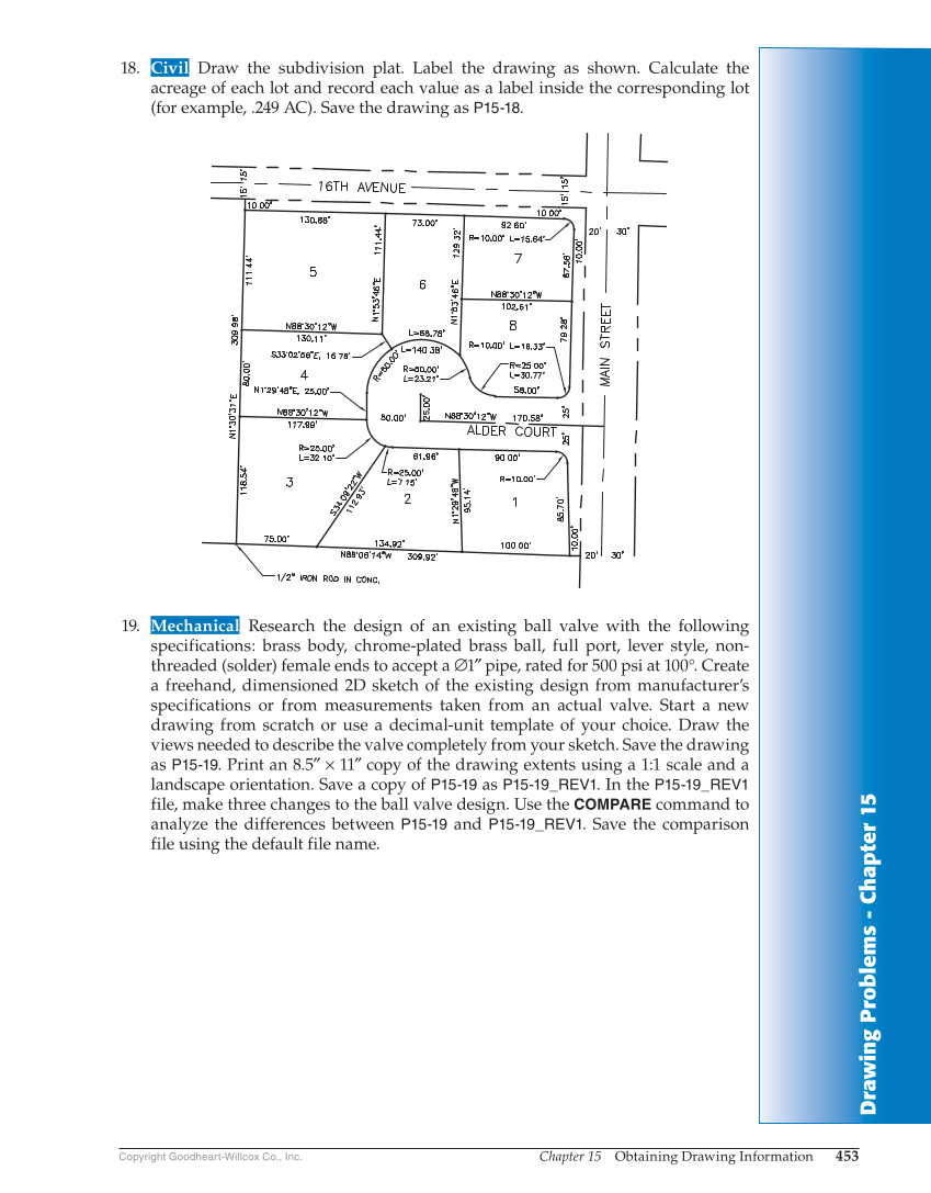 Drawing Problems - Chapter 1 5 Chapter 15 Obtaining Drawing Information 453 Copyright Goodheart-Willcox Co., Inc. 18. Civil Draw the subdivision plat. Label the drawing as shown. Calculate the acreage of each lot and record each value as a label inside the corresponding lot (for example, .249 AC). Save the drawing as P15-18. 19. Mechanical Research the design of an existing ball valve with the following specifications: brass body, chrome-plated brass ball, full port, lever style, non- threaded (solder) female ends to accept a ∅1″ pipe, rated for 500 psi at 100°. Create a freehand, dimensioned 2D sketch of the existing design from manufacturer’s specifications or from measurements taken from an actual valve. Start a new drawing from scratch or use a decimal-unit template of your choice. Draw the views needed to describe the valve completely from your sketch. Save the drawing as P15-19. Print an 8.5″ × 11″ copy of the drawing extents using a 1:1 scale and a landscape orientation. Save a copy of P15-19 as P15-19_REV1. In the P15-19_REV1 file, make three changes to the ball valve design. Use the COMPARE command to analyze the differences between P15-19 and P15-19_REV1. Save the comparison file using the default file name.