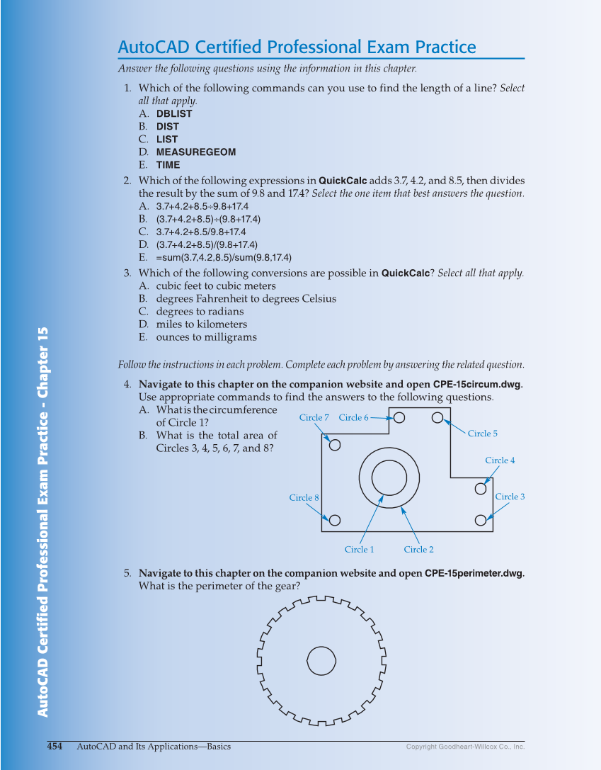AutoCAD Certified Professional Exam Practice - Chapter 1 5 454 AutoCAD and Its Applications—Basics Copyright Goodheart-Willcox Co., Inc. AutoCAD Certified Professional Exam Practice Answer the following questions using the information in this chapter. 1. Which of the following commands can you use to find the length of a line? Select all that apply. A. DBLIST B. DIST C. LIST D. MEASUREGEOM E. TIME 2. Which of the following expressions in QuickCalc adds 3.7, 4.2, and 8.5, then divides the result by the sum of 9.8 and 17.4? Select the one item that best answers the question. A. 3.7+4.2+8.5÷9.8+17.4 B. (3.7+4.2+8.5)÷(9.8+17.4) C. 3.7+4.2+8.5/9.8+17.4 D. (3.7+4.2+8.5)/(9.8+17.4) E. =sum(3.7,4.2,8.5)/sum(9.8,17.4) 3. Which of the following conversions are possible in QuickCalc? Select all that apply. A. cubic feet to cubic meters B. degrees Fahrenheit to degrees Celsius C. degrees to radians D. miles to kilometers E. ounces to milligrams Follow the instructions in each problem. Complete each problem by answering the related question. 4. Navigate to this chapter on the companion website and open CPE-15circum.dwg. Use appropriate commands to find the answers to the following questions. A. What is the circumference of Circle 1? B. What is the total area of Circles 3, 4, 5, 6, 7, and 8? Circle 8 Circle 5 Circle 3 Circle 4 Circle 7 Circle 6 Circle 1 Circle 2 5. Navigate to this chapter on the companion website and open CPE-15perimeter.dwg. What is the perimeter of the gear?