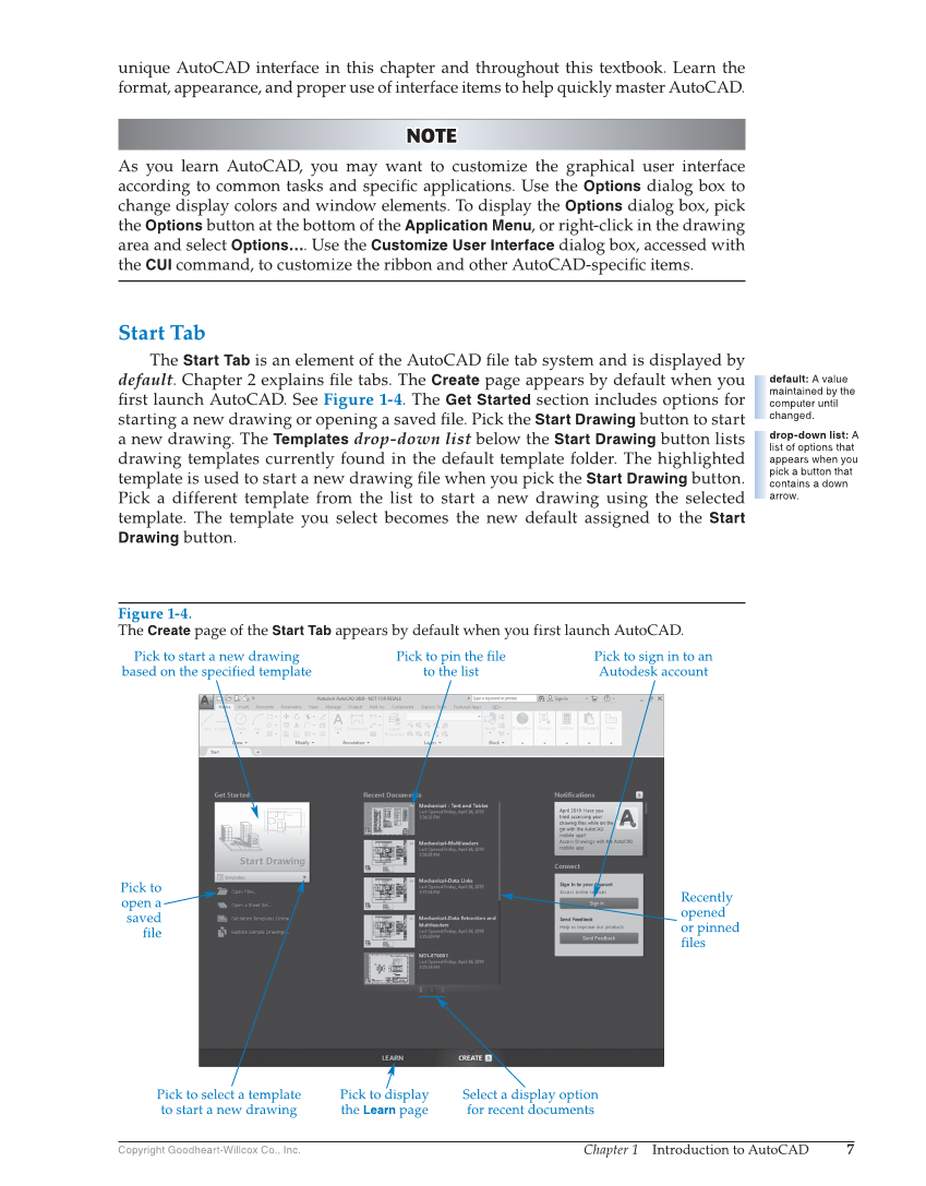 Chapter 1 Introduction to AutoCAD 7 Copyright Goodheart-Willcox Co., Inc. unique AutoCAD interface in this chapter and throughout this textbook. Learn the format, appearance, and proper use of interface items to help quickly master AutoCAD. NOTE NOTE As you learn AutoCAD, you may want to customize the graphical user interface according to common tasks and specifi c applications. Use the Options dialog box to change display colors and window elements. To display the Options dialog box, pick the Options button at the bottom of the Application Menu, or right-click in the drawing area and select Options…. Use the Customize User Interface dialog box, accessed with the CUI command, to customize the ribbon and other AutoCAD-specifi c items. Start Tab The Start Tab is an element of the AutoCAD fi le tab system and is displayed by default. Chapter 2 explains fi le tabs. The Create page appears by default when you fi rst launch AutoCAD. See Figure 1-4. The Get Started section includes options for starting a new drawing or opening a saved fi le. Pick the Start Drawing button to start a new drawing. The Templates drop-down list below the Start Drawing button lists drawing templates currently found in the default template folder. The highlighted template is used to start a new drawing fi le when you pick the Start Drawing button. Pick a different template from the list to start a new drawing using the selected template. The template you select becomes the new default assigned to the Start Drawing button. default: A value maintained by the computer until changed. drop-down list: A list of options that appears when you pick a button that contains a down arrow. Figure 1-4. The Create page of the Start Tab appears by default when you first launch AutoCAD. Pick to sign in to an Autodesk account Pick to select a template to start a new drawing Pick to start a new drawing based on the specified template Pick to pin the file to the list Pick to open a saved file Pick to display the Learn page Select a display option for recent documents Recently opened or pinned files