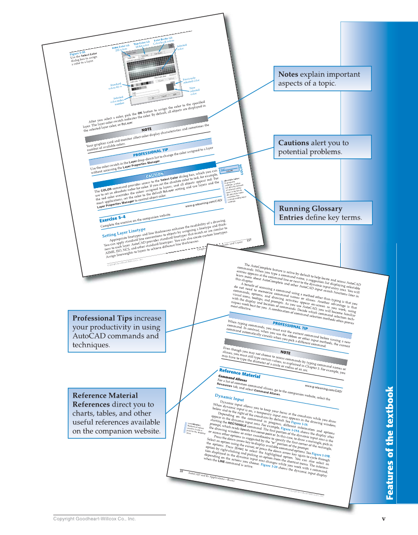 Features of the textbook v Copyright Goodheart-Willcox Co., Inc. 137 Copyright Goodheart-W illcox Co., Inc. Chapter 5 Line Standardsand Layers Figure Use the dialogrboxatoayer.ignasslSelectColorto5-10. a colo Index Color tab 255colors True Color tab 24-bitcolor Color Color bookcolorsBookstab Previously selectedcolor New selected color Selected color Standard colors #1–9 Selected colorindex number After you select a color, pick the OK button to assign t h e color to layer.Theldlarcolcolor, aye or swatchindicr.tes a thecolor.Bydefault, all objects aredisplayedinhedecifipset the selecte yer orByLaye Your graphicscaableacoloronitor rd nd m affectcolordisplaycharacteristics and sometimes the number of avail s. Use thecoloessing r swatchinLayer theLayerdrop-dManager.litochange own st thecolorassigned to a layer without acc the Prop erties The COLOR commandvalueforcslor.Ifnedult provides access to theset Select Color dialog box, which you can useto set anabsorrides lute o you the absolutelloobjects c lor to red,for example, the red color ove the color assig to layers, and a appear red. For most applications,Managerctolcontrol set the oor to the defa ByLayer setting and use layers and t h e Layer Properties objectcolor. Exercise 5-4rcise www.g -wlearning.com/CAD/ Complete the exe on thecompanion website. SettingLayerlinetypespndnventhicknndardclinuncantialthresses.lincustoeeandetypes. Linety e Appropriy ate a line t esses enhby a e he eadability of a drawing.-t Youcan appl standardlinecprovideslinetypes.tYo o ionsto obje ts assgninma g etyp hick ness to eachlayer. AutoCADstandard sta etypes at atch or ar similar to ASME,ISO,NCS,tsnd a other c so create m lin Assignlineweigh to layers to achievedifferen lineth hickn NOTE PROF ESSIONAL TIP CAUTION CO L O R Type COLOR absolute value: In property sett ings, a value setdirectlyinsteadbyncedrefereblock.byevaluteorrabsoluyeAnlaof overesponding rides the corr layer settings. F e a t u r e s o f t h e t e x t b o o k Ch ap te r 5 L i n e St a n d a r d s a n d La y ty p ff e r e n t li n e t ic kn 20 Copyright Goodheart-Willcox Co., Inc. coordinates: Numerical values used to locate a point in the drawing area. AutoCAD and Its Applications—Basics The AutoComplete feature is active by default to help locate and access AutoCAD commands. When you type a command name, a suggestion list displaying selectable entries appears at the command line or next to the dynamic input entry area. You will learn more about AutoComplete and other AutoCAD input search functions later in this chapter. A benefit of accessing a command using a method other than typing is that you do not need to memorize command names or aliases. Another advantage is that commands, options, and drawing activities appear on-screen as you work, using visual icons, tooltips, and prompts. As you use AutoCAD, you will become familiar with the display and location of commands. Decide which command selection tech- niques work best for you. A combination of command selection methods often proves most effective. When typing commands, you must exit the current command before issuing a new command. In contrast, when you use the ribbon or other input methods, the current command automatically cancels when you pick a different command. Even though you may not choose to access commands by typing command names or aliases, you must still type certain values, as explained in Chapter 3. For example, you may have to type the diameter of a circle or radius of an arc. R eference Material www.g-wlearning.com/CAD/ Command Aliases For a list of common command aliases, the companion website, select the Resources tab, and select Command Aliagoesto s . Dynamic Input Dynamic input allows you to keep your focus at the crosshairs while you draw. When dynamic input is on, a temporary input area appears in the drawing window, below and to the right of the crosshairs by default. See Figure 1-18. Depending on the command in progress, different information and options appear in the dynamic input area. For example, Figure 1-19A shows the display after starting the RECTANGLE command. The first portion of the dynamic input area is the prompt, which reads Specify first corner point or . In this case, to draw a rectangle, pick in the drawing window or enter coordinates to specify the first corner of the rectangle, or access other options as suggested by the “or ” portion of the prompt. Press the down arrow key to display available command options. See Figure 1-19B. Select an option using the cursor, or press the down arrow key again to cycle through the options. Press [Enter] to select the highlighted option. You can also select an option by right-clicking and picking an option from the shortcut menu. The informa- tion displayed in the dynamic input area changes while you work with a command, depending on the actions you choose. Figure 1-20 shows the dynamic input display when the LINE command is active. NOTE PR OFESSIONAL TIP Running Glossary Entries defi ne key terms. Reference Material References direct you to charts, tables, and other useful references available on the companion website. Professional Tips increase your productivity in using AutoCAD commands and techniques. Notes explain important aspects of a topic. Cautions alert you to potential problems.