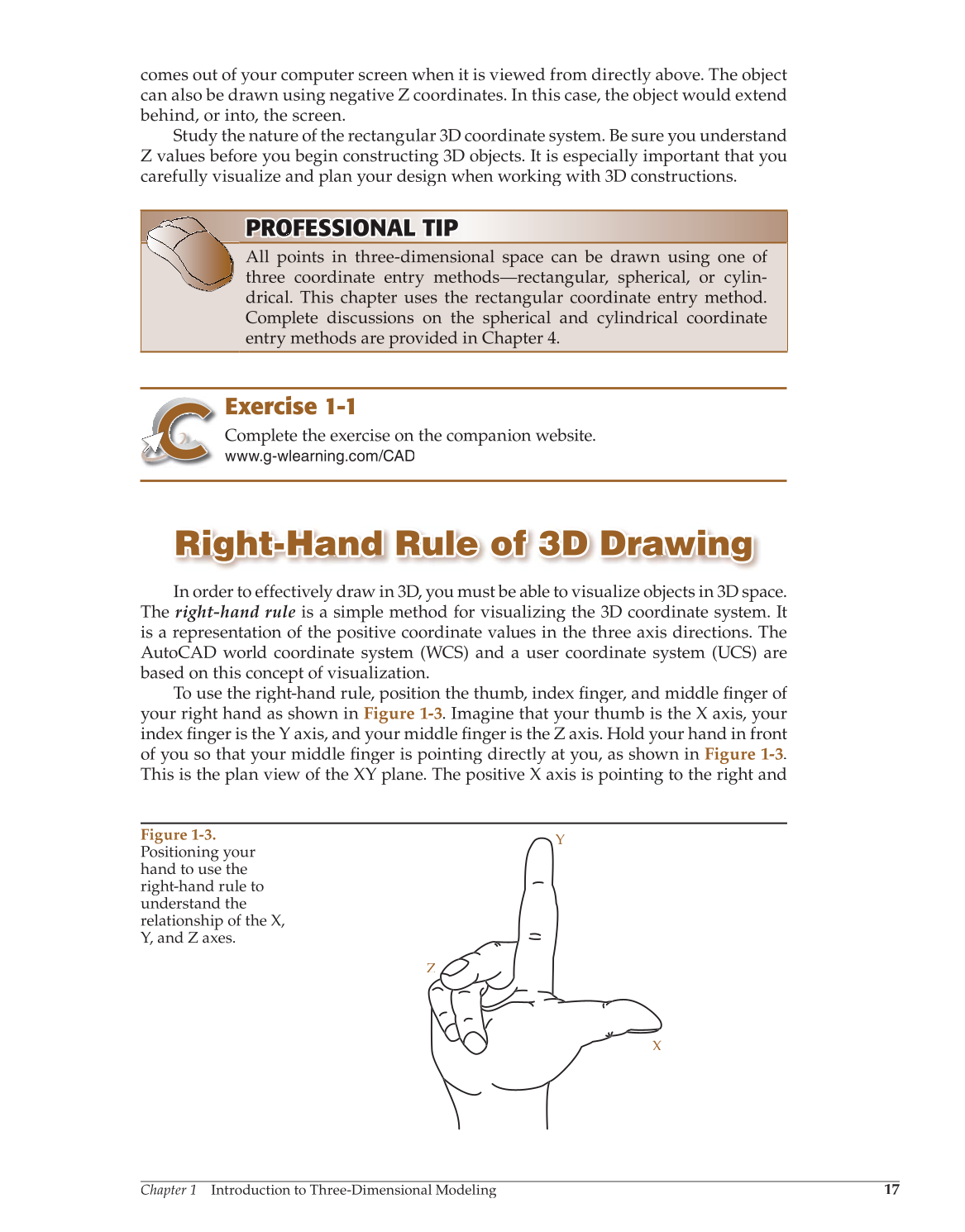 your right hand as shown in Figure 1-3. Imagine that your thumb is the X axis, your