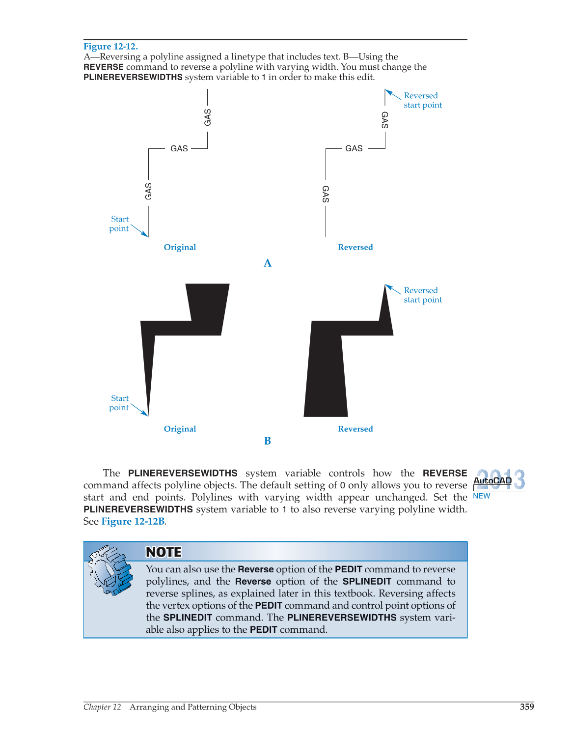 A—Reversing a polyline assigned a linetype that includes text. B—Using the
