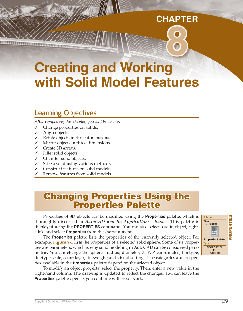 173 Copyright Goodheart-Willcox Co., Inc. Learning Objectives will be able to: After completing this chapter, you u ✓ Change properties on solids. d ✓ Align objects. ✓ jects Rotate o bj in three dimensions. m ✓ Mirror objects in three dimensions. ✓ Create 3D arrays. ✓ Fillet solid objects. ✓ Chamfer solid objects. ✓ Slice a solid using various methods. ✓ Construct features on solid models. ✓ Remove features from solid models. Changing Properties Using the Changing Properties Using the Properties Palette Properties Palette Properties of 3D objects can be modifi using the fied Properties palette, which is thoroughly discussed in AutoCAD and Its Applications—Basics. This palette is displayed using the PROPERTIES command. You can also select a solid object, right- click, and select Properties from the shortcut menu. The Properties palette lists the properties of the currently selected object. For example, Figure 8-1 lists the properties of a selected solid sphere. Some of its proper- ties are parameters, which is why solid modeling in AutoCAD can be considered para- metric. You can change the sphere’s radius diameter X, Y, Z coordinates linetype linetype scale color layer lineweight and visual settings. The categories and proper- ties available in the Properties palette depend on the selected object. To modify an object property, select the property. Then, enter a new value in the right-hand column. The drawing is updated to refl the changes. You can leave the flect Properties palette open as you continue with your work. PROPERTIES Ribbon View Palettes Properties Palette Type PROPERTIES PR [Ctrl]+[1] Creating and Working with Solid Model Features CHAPTER 8 8