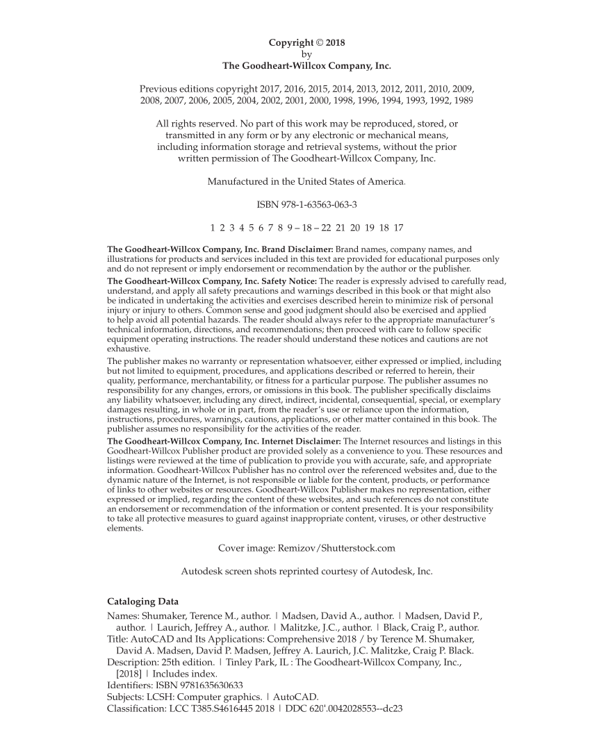 Copyright © 2018 by The Goodheart-Willcox Company, Inc. Previous editions copyright 2017, 2016, 2015, 2014, 2013, 2012, 2011, 2010, 2009, 2008, 2007, 2006, 2005, 2004, 2002, 2001, 2000, 1998, 1996, 1994, 1993, 1992, 1989 All rights reserved. No part of this work may be reproduced, stored, or transmitted in any form or by any electronic or mechanical means, including information storage and retrieval systems, without the prior written permission of The Goodheart-Willcox Company, Inc. Manufactured in the United States of America. ISBN 978-1-63563-063-3 1 2 3 4 5 6 7 8 9 – 18 – 22 21 20 19 18 17 The Goodheart-Willcox Company, Inc. Brand Disclaimer: Brand names, company names, and illustrations for products and services included in this text are provided for educational purposes only and do not represent or imply endorsement or recommendation by the author or the publisher. The Goodheart-Willcox Company, Inc. Safety Notice: The reader is expressly advised to carefully read, understand, and apply all safety precautions and warnings described in this book or that might also be indicated in undertaking the activities and exercises described herein to minimize risk of personal injury or injury to others. Common sense and good judgment should also be exercised and applied to help avoid all potential hazards. The reader should always refer to the appropriate manufacturer’s technical information, directions, and recommendations then proceed with care to follow specificfi equipment operating instructions. The reader should understand these notices and cautions are not exhaustive. The publisher makes no warranty or representation whatsoever, either expressed or implied, including but not limited to equipment, procedures, and applications described or referred to herein, their quality, performance, merchantability, or fitness for a particular purpose. The publisher assumes no fi responsibility for any changes, errors, or omissions in this book. The publisher specifi disclaims fically any liability whatsoever, including any direct, indirect, incidental, consequential, special, or exemplary damages resulting, in whole or in part, from the reader’s use or reliance upon the information, instructions, procedures, warnings, cautions, applications, or other matter contained in this book. The publisher assumes no responsibility for the activities of the reader. The Goodheart-Willcox Company, Inc. Internet Disclaimer: The Internet resources and listings in this Goodheart-Willcox Publisher product are provided solely as a convenience to you. These resources and listings were reviewed at the time of publication to provide you with accurate, safe, and appropriate information. Goodheart-Willcox Publisher has no control over the referenced websites and, due to the dynamic nature of the Internet, is not responsible or liable for the content, products, or performance of links to other websites or resources. Goodheart-Willcox Publisher makes no representation, either expressed or implied, regarding the content of these websites, and such references do not constitute an endorsement or recommendation of the information or content presented. It is your responsibility to take all protective measures to guard against inappropriate content, viruses, or other destructive elements. Cover image: Remizov/Shutterstock.com Autodesk screen shots reprinted courtesy of Autodesk, Inc. Cataloging Data Names: Shumaker, Terence M., author. | Madsen, David A., author. | Madsen, David P., author. | Laurich, Jeffrey A., author. | Malitzke, J.C., author. | Black, Craig P., author. Title: AutoCAD and Its Applications: Comprehensive 2018 / by Terence M. Shumaker, David A. Madsen, David P. Madsen, Jeffrey A. Laurich, J.C. Malitzke, Craig P. Black. Description: 25th edition. | Tinley Park, IL : The Goodheart-Willcox Company, Inc., [2018] | Includes index. Identifi ISBN 9781635630633 fiers: Subjects: LCSH: Computer graphics. | AutoCAD. Classifi LCC T385.S4616445 2018 | DDC 620'.0042028553--dc23 fication: