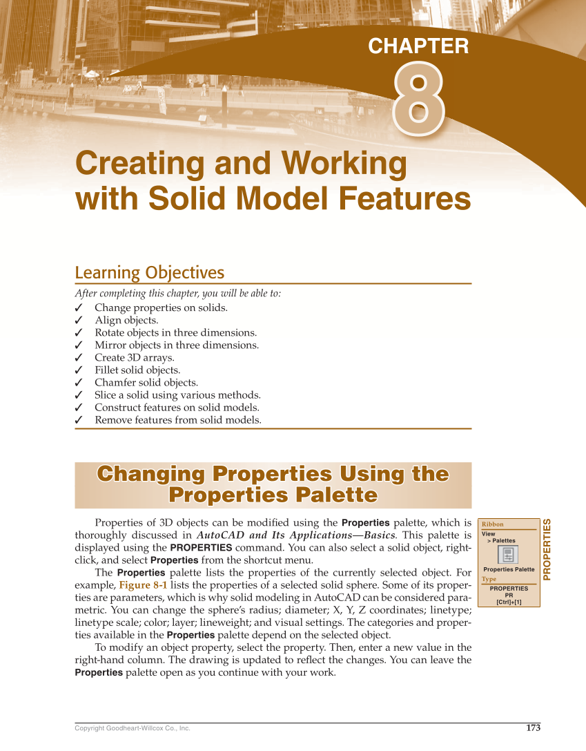 173 Copyright Goodheart-Willcox Co., Inc. Learning Objectives After completing this chapter, you will be able to: ✓ Change properties on solids. ✓ Align objects. ✓ Rotate objects in three dimensions. ✓ Mirror objects in three dimensions. ✓ Create 3D arrays. ✓ Fillet solid objects. ✓ Chamfer solid objects. ✓ Slice a solid using various methods. ✓ Construct features on solid models. ✓ Remove features from solid models. Changing Properties Using the Changing Properties Using the Properties Palette Properties Palette Properties of 3D objects can be modifi ed using the Properties palette, which is thoroughly discussed in AutoCAD and Its Applications—Basics. This palette is displayed using the PROPERTIES command. You can also select a solid object, right- click, and select Properties from the shortcut menu. The Properties palette lists the properties of the currently selected object. For example, Figure 8-1 lists the properties of a selected solid sphere. Some of its proper- ties are parameters, which is why solid modeling in AutoCAD can be considered para- metric. You can change the sphere’s radius diameter X, Y, Z coordinates linetype linetype scale color layer lineweight and visual settings. The categories and proper- ties available in the Properties palette depend on the selected object. To modify an object property, select the property. Then, enter a new value in the right-hand column. The drawing is updated to refl ect the changes. You can leave the Properties palette open as you continue with your work. PROPERTIES Ribbon View Palettes Properties Palette Type PROPERTIES PR [Ctrl]+[1] Creating and Working with Solid Model Features CHAPTER 8 8