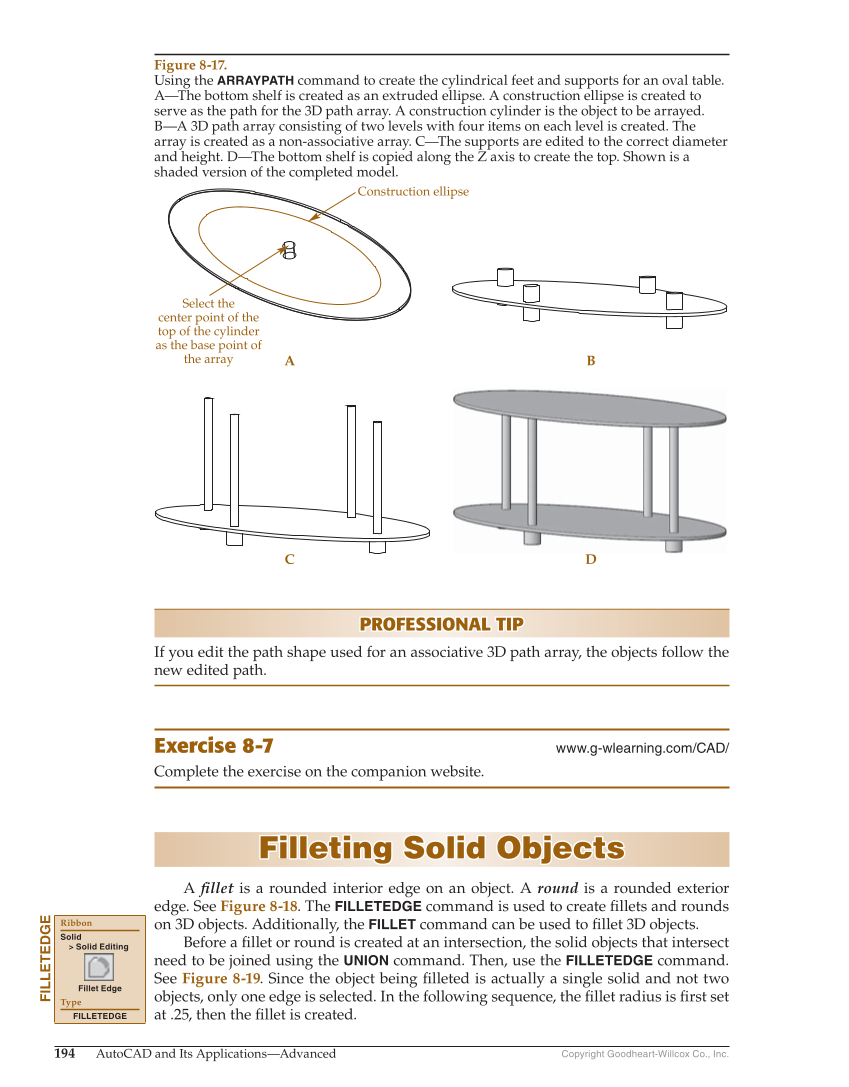 Copyright Goodheart-Willcox Co., Inc. 194 AutoCAD and Its Applications—Advanced PROFESSIONAL TIP PROFESSIONAL TIP If you edit the path shape used for an associative 3D path array, the objects follow the new edited path. Ex ercise 8-7 www.g-wlearning.com/CAD/ Complete the exercise on the companion website. Filleting Solid Objects Filleting Solid Objects A fi llet is a rounded interior edge on an object. A round is a rounded exterior edge. See Figure 8-18. The FILLETEDGE command is used to create fi llets and rounds on 3D objects. Additionally, the FILLET command can be used to fi llet 3D objects. Before a fi llet or round is created at an intersection, the solid objects that intersect need to be joined using the UNION command. Then, use the FILLETEDGE command. See Figure 8-19. Since the object being fi lleted is actually a single solid and not two objects, only one edge is selected. In the following sequence, the fi llet radius is fi rst set at .25, then the fi llet is created. FILLETEDGE Ribbon Solid Solid Editing Fillet Edge Type FILLETEDGE A C B D Construction ellipse Select the center point of the top of the cylinder as the base point of the array Figure 8-17. Using the ARRAYPATH command to create the cylindrical feet and supports for an oval table. A—The bottom shelf is created as an extruded ellipse. A construction ellipse is created to serve as the path for the 3D path array. A construction cylinder is the object to be arrayed. B—A 3D path array consisting of two levels with four items on each level is created. The array is created as a non-associative array. C—The supports are edited to the correct diameter and height. D—The bottom shelf is copied along the Z axis to create the top. Shown is a shaded version of the completed model.
