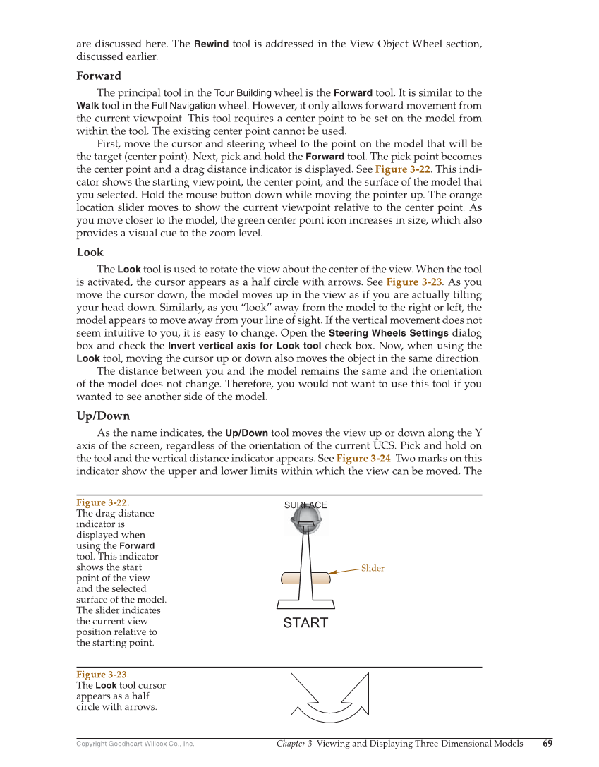 Copyright Goodheart-Willcox Co., Inc. Chapter 3 Viewing and Displaying Three-Dimensional Models 69 are discussed here. The Rewind tool is addressed in the View Object Wheel section, discussed earlier. Forward The principal tool in the Tour Building wheel is the Forward tool. It is similar to the Walk tool in the Full Navigation wheel. However, it only allows forward movement from the current viewpoint. This tool requires a center point to be set on the model from within the tool. The existing center point cannot be used. First, move the cursor and steering wheel to the point on the model that will be the target (center point). Next, pick and hold the Forward tool. The pick point becomes the center point and a drag distance indicator is displayed. See Figure 3-22. This indi- cator shows the starting viewpoint, the center point, and the surface of the model that you selected. Hold the mouse button down while moving the pointer up. The orange location slider moves to show the current viewpoint relative to the center point. As you move closer to the model, the green center point icon increases in size, which also provides a visual cue to the zoom level. Look The Look tool is used to rotate the view about the center of the view. When the tool is activated, the cursor appears as a half circle with arrows. See Figure 3-23. As you move the cursor down, the model moves up in the view as if you are actually tilting your head down. Similarly, as you “look” away from the model to the right or left, the model appears to move away from your line of sight. If the vertical movement does not seem intuitive to you, it is easy to change. Open the Steering Wheels Settings dialog box and check the Invert vertical axis for Look tool check box. Now, when using the Look tool, moving the cursor up or down also moves the object in the same direction. The distance between you and the model remains the same and the orientation of the model does not change. Therefore, you would not want to use this tool if you wanted to see another side of the model. Up/Down As the name indicates, the Up/Down tool moves the view up or down along the Y axis of the screen, regardless of the orientation of the current UCS. Pick and hold on the tool and the vertical distance indicator appears. See Figure 3-24. Two marks on this indicator show the upper and lower limits within which the view can be moved. The Slider Figure 3-22. The drag distance indicator is displayed when using the Forward tool. This indicator shows the start point of the view and the selected surface of the model. The slider indicates the current view position relative to the starting point. Figure 3-23. The Look tool cursor appears as a half circle with arrows.