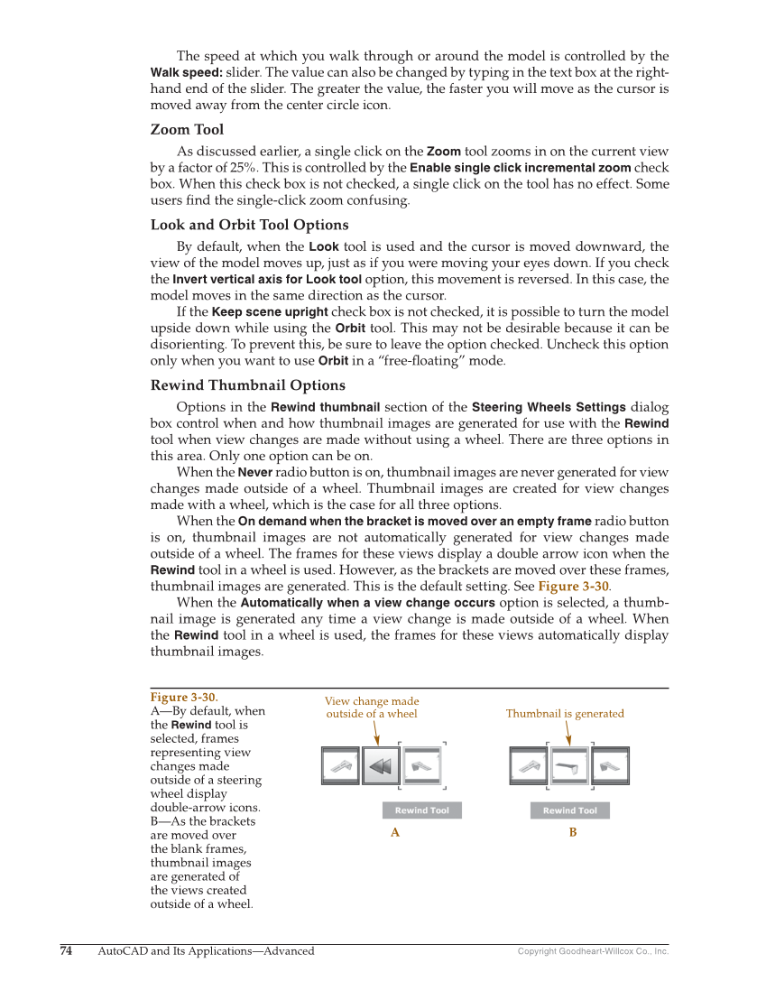 Copyright Goodheart-Willcox Co., Inc. 74 AutoCAD and Its Applications—Advanced The speed at which you walk through or around the model is controlled by the Walk speed: slider. The value can also be changed by typing in the text box at the right- hand end of the slider. The greater the value, the faster you will move as the cursor is moved away from the center circle icon. Zoom Tool As discussed earlier, a single click on the Zoom tool zooms in on the current view by a factor of 25%. This is controlled by the Enable single click incremental zoom check box. When this check box is not checked, a single click on the tool has no effect. Some users fi nd the single-click zoom confusing. Look and Orbit Tool Options By default, when the Look tool is used and the cursor is moved downward, the view of the model moves up, just as if you were moving your eyes down. If you check the Invert vertical axis for Look tool option, this movement is reversed. In this case, the model moves in the same direction as the cursor. If the Keep scene upright check box is not checked, it is possible to turn the model upside down while using the Orbit tool. This may not be desirable because it can be disorienting. To prevent this, be sure to leave the option checked. Uncheck this option only when you want to use Orbit in a “free-fl oating” mode. Rewind Thumbnail Options Options in the Rewind thumbnail section of the Steering Wheels Settings dialog box control when and how thumbnail images are generated for use with the Rewind tool when view changes are made without using a wheel. There are three options in this area. Only one option can be on. When the Never radio button is on, thumbnail images are never generated for view changes made outside of a wheel. Thumbnail images are created for view changes made with a wheel, which is the case for all three options. When the On demand when the bracket is moved over an empty frame radio button is on, thumbnail images are not automatically generated for view changes made outside of a wheel. The frames for these views display a double arrow icon when the Rewind tool in a wheel is used. However, as the brackets are moved over these frames, thumbnail images are generated. This is the default setting. See Figure 3-30. When the Automatically when a view change occurs option is selected, a thumb- nail image is generated any time a view change is made outside of a wheel. When the Rewind tool in a wheel is used, the frames for these views automatically display thumbnail images. View change made outside of a wheel Thumbnail is generated A B Figure 3-30. A—By default, when the Rewind tool is selected, frames representing view changes made outside of a steering wheel display double-arrow icons. B—As the brackets are moved over the blank frames, thumbnail images are generated of the views created outside of a wheel.