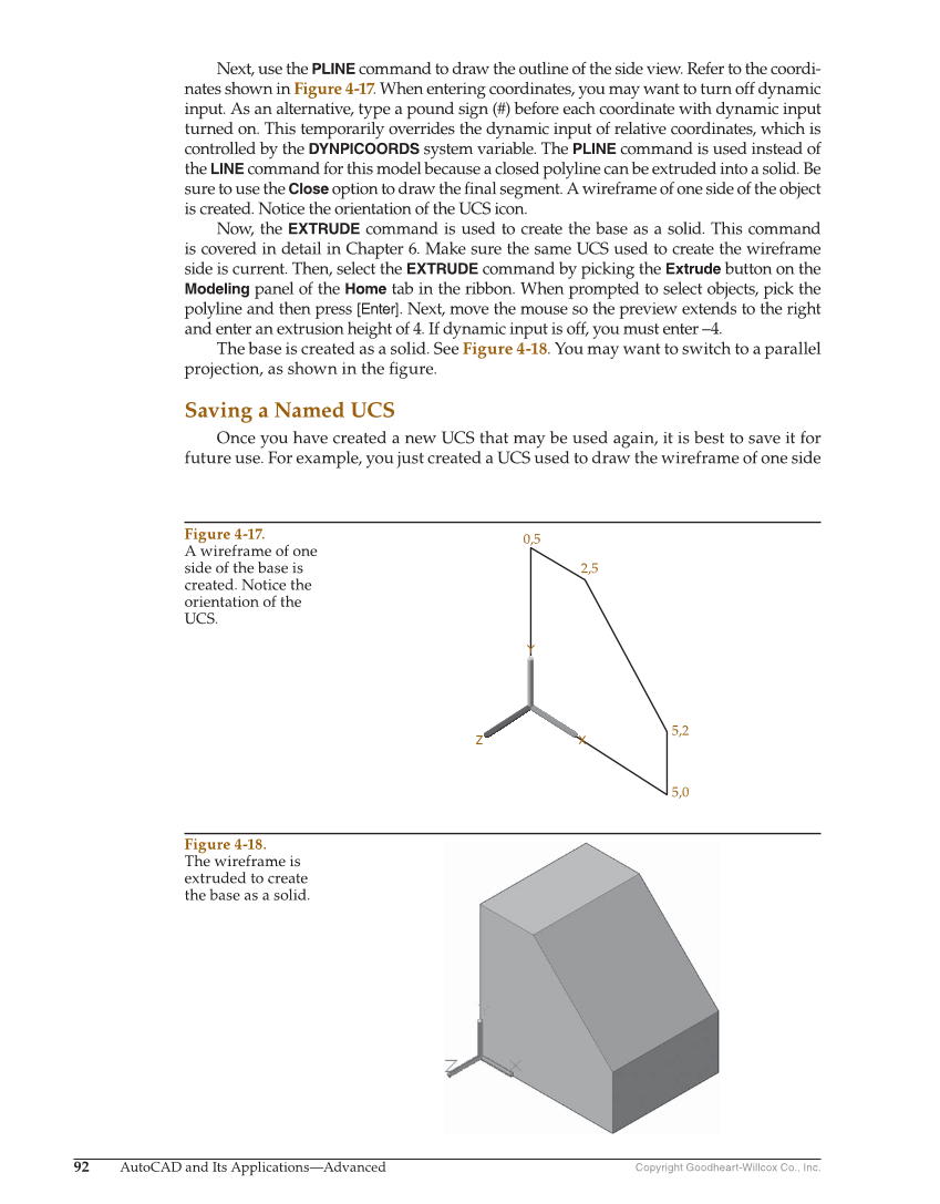 Copyright Goodheart-Willcox Co., Inc. 92 AutoCAD and Its Applications—Advanced Next, use the PLINE command to draw the outline of the side view. Refer to the coordi- nates shown in Figure 4-17. When entering coordinates, you may want to turn off dynamic input. As an alternative, type a pound sign (#) before each coordinate with dynamic input turned on. This temporarily overrides the dynamic input of relative coordinates, which is controlled by the DYNPICOORDS system variable. The PLINE command is used instead of the LINE command for this model because a closed polyline can be extruded into a solid. Be sure to use the Close option to draw the fi nal segment. A wireframe of one side of the object is created. Notice the orientation of the UCS icon. Now, the EXTRUDE command is used to create the base as a solid. This command is covered in detail in Chapter 6. Make sure the same UCS used to create the wireframe side is current. Then, select the EXTRUDE command by picking the Extrude button on the Modeling panel of the Home tab in the ribbon. When prompted to select objects, pick the polyline and then press [Enter]. Next, move the mouse so the preview extends to the right and enter an extrusion height of 4. If dynamic input is off, you must enter –4. The base is created as a solid. See Figure 4-18. You may want to switch to a parallel projection, as shown in the fi gure. Saving a Named UCS Once you have created a new UCS that may be used again, it is best to save it for future use. For example, you just created a UCS used to draw the wireframe of one side 0,5 2,5 5,2 5,0 Figure 4-17. A wireframe of one side of the base is created. Notice the orientation of the UCS. Figure 4-18. The wireframe is extruded to create the base as a solid.