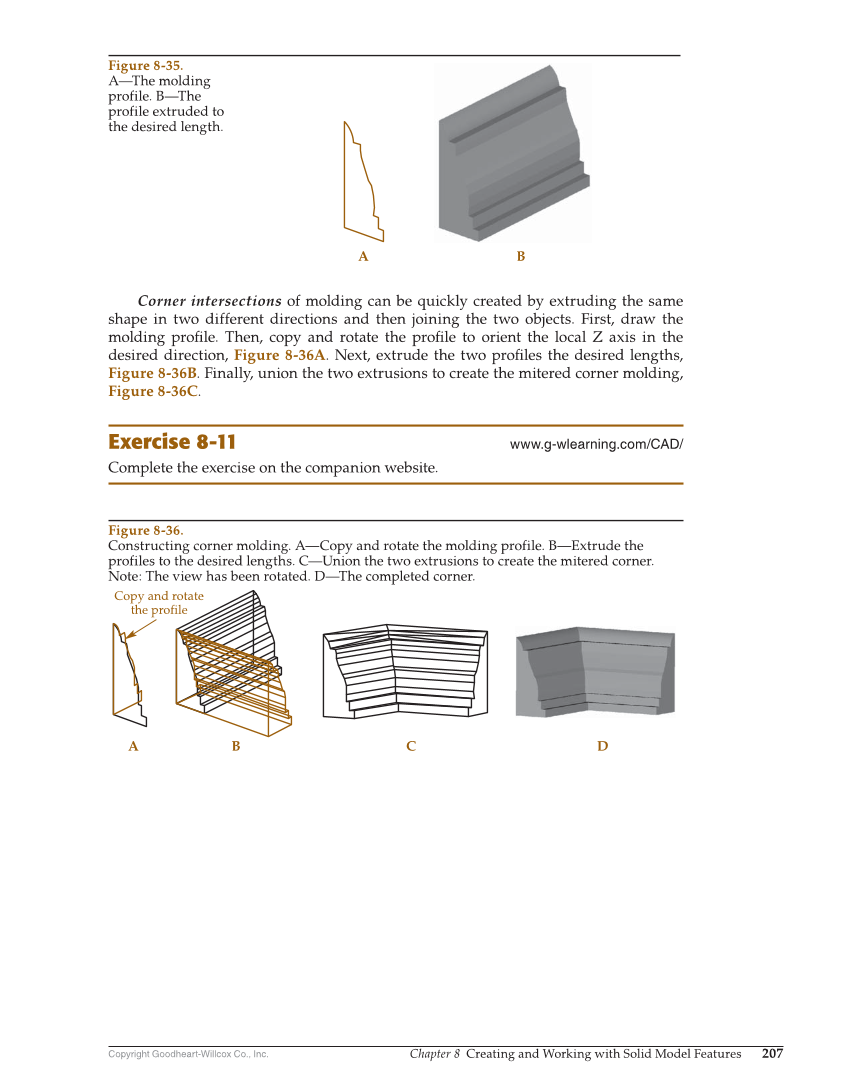 Copyright Goodheart-Willcox Co., Inc. Chapter 8 Creating and Working with Solid Model Features 207 Corner intersections of molding can be quickly created by extruding the same shape in two different directions and then joining the two objects. First, draw the molding profi le. Then, copy and rotate the profi le to orient the local Z axis in the desired direction, Figure 8-36A. Next, extrude the two profi les the desired lengths, Figure 8-36B. Finally, union the two extrusions to create the mitered corner molding, Figure 8-36C. Exercise 8-11 www.g-wlearning.com/CAD/ Complete the exercise on the companion website. Copy and rotate the profile B A C D A B Figure 8-35. A—The molding profile. B—The profile extruded to the desired length. Figure 8-36. Constructing corner molding. A—Copy and rotate the molding profile. B—Extrude the profiles to the desired lengths. C—Union the two extrusions to create the mitered corner. Note: The view has been rotated. D—The completed corner.