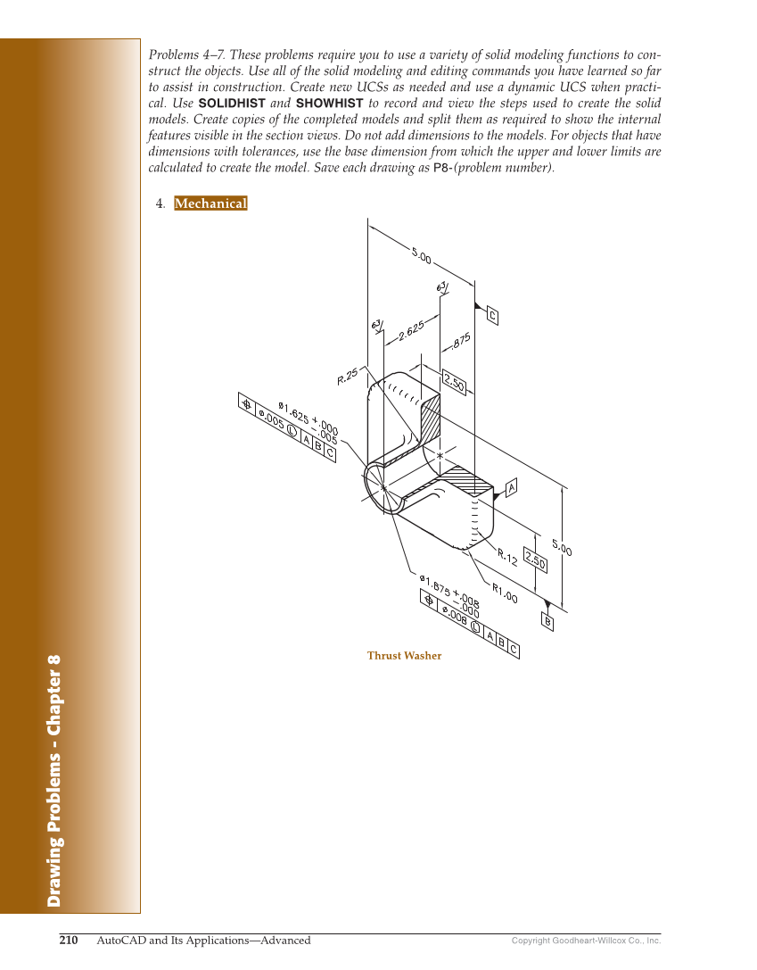 Drawing Problems - Chapter 8 Copyright Goodheart-Willcox Co., Inc. 210 AutoCAD and Its Applications—Advanced Problems 4–7. These problems require you to use a variety of solid modeling functions to con- struct the objects. Use all of the solid modeling and editing commands you have learned so far to assist in construction. Create new UCSs as needed and use a dynamic UCS when practi- cal. Use SOLIDHIST and SHOWHIST to record and view the steps used to create the solid models. Create copies of the completed models and split them as required to show the internal features visible in the section views. Do not add dimensions to the models. For objects that have dimensions with tolerances, use the base dimension from which the upper and lower limits are calculated to create the model. Save each drawing as P8-(problem number). 4. Mechanical Thrust Washer