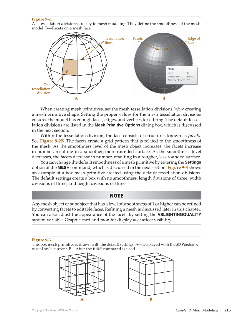 Copyright Goodheart-Willcox Co., Inc. Chapter 9 Mesh Modeling 215 When creating mesh primitives, set the mesh tessellation divisions before creating a mesh primitive shape. Setting the proper values for the mesh tessellation divisions ensures the model has enough faces, edges, and vertices for editing. The default tessel- lation divisions are listed in the Mesh Primitive Options dialog box, which is discussed in the next section. Within the tessellation division, the face consists of structures known as facets. See Figure 9-2B. The facets create a grid pattern that is related to the smoothness of the mesh. As the smoothness level of the mesh object increases, the facets increase in number, resulting in a smoother, more rounded surface. As the smoothness level decreases, the facets decrease in number, resulting in a rougher, less rounded surface. You can change the default smoothness of a mesh primitive by entering the Settings option of the MESH command, which is discussed in the next section. Figure 9-3 shows an example of a box mesh primitive created using the default tessellation divisions. The default settings create a box with no smoothness, length divisions of three, width divisions of three, and height divisions of three. NOTE NOTE Any mesh object or subobject that has a level of smoothness of 1 or higher can be refi ned by converting facets to editable faces. Refi ning a mesh is discussed later in this chapter. You can also adjust the appearance of the facets by setting the VSLIGHTINGQUALITY system variable. Graphic card and monitor display may affect visibility. Facets A B Tessellation lines One tessellation division Edge of face Figure 9-2. A—Tessellation divisions are key to mesh modeling. They define the smoothness of the mesh model. B—Facets on a mesh face. A B Figure 9-3. This box mesh primitive is drawn with the default settings. A—Displayed with the 2D Wireframe visual style current. B—After the HIDE command is used.