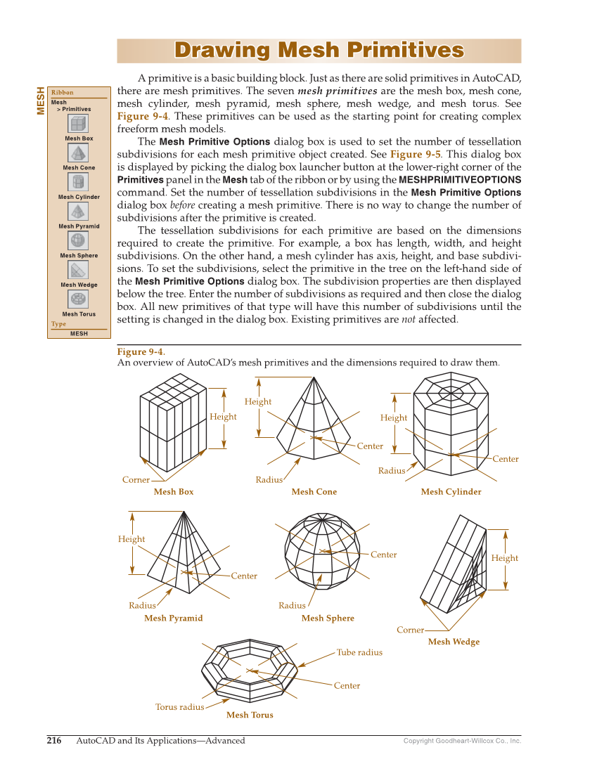 Copyright Goodheart-Willcox Co., Inc. 216 AutoCAD and Its Applications—Advanced Drawing Mesh Primitives Drawing Mesh Primitives A primitive is a basic building block. Just as there are solid primitives in AutoCAD, there are mesh primitives. The seven mesh primitives are the mesh box, mesh cone, mesh cylinder, mesh pyramid, mesh sphere, mesh wedge, and mesh torus. See Figure 9-4. These primitives can be used as the starting point for creating complex freeform mesh models. The Mesh Primitive Options dialog box is used to set the number of tessellation subdivisions for each mesh primitive object created. See Figure 9-5. This dialog box is displayed by picking the dialog box launcher button at the lower-right corner of the Primitives panel in the Mesh tab of the ribbon or by using the MESHPRIMITIVEOPTIONS command. Set the number of tessellation subdivisions in the Mesh Primitive Options dialog box before creating a mesh primitive. There is no way to change the number of subdivisions after the primitive is created. The tessellation subdivisions for each primitive are based on the dimensions required to create the primitive. For example, a box has length, width, and height subdivisions. On the other hand, a mesh cylinder has axis, height, and base subdivi- sions. To set the subdivisions, select the primitive in the tree on the left-hand side of the Mesh Primitive Options dialog box. The subdivision properties are then displayed below the tree. Enter the number of subdivisions as required and then close the dialog box. All new primitives of that type will have this number of subdivisions until the setting is changed in the dialog box. Existing primitives are not affected. MESH Ribbon Mesh Primitives Mesh Box Mesh Cone Mesh Cylinder Mesh Pyramid Mesh Sphere Mesh Wedge Mesh Torus Type MESH Mesh Box Mesh Pyramid Mesh Cone Height Height Height Corner Center Radius Mesh Cylinder Radius Center Height Center Radius Mesh Sphere Mesh Torus Center Radius Mesh Wedge Height Corner Torus radius Center Tube radius Figure 9-4. An overview of AutoCAD’s mesh primitives and the dimensions required to draw them.