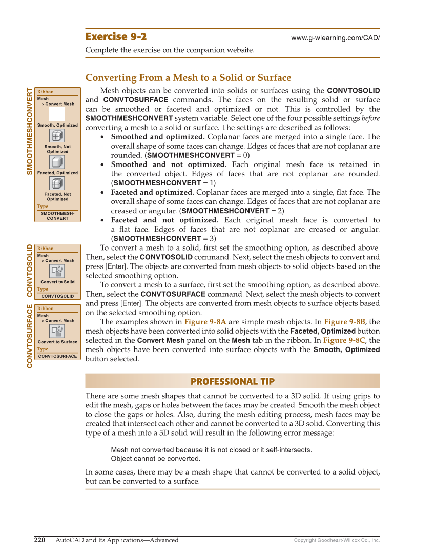 Copyright Goodheart-Willcox Co., Inc. 220 AutoCAD and Its Applications—Advanced Exercise 9-2 www.g-wlearning.com/CAD/ Complete the exercise on the companion website. Converting From a Mesh to a Solid or Surface Mesh objects can be converted into solids or surfaces using the CONVTOSOLID and CONVTOSURFACE commands. The faces on the resulting solid or surface can be smoothed or faceted and optimized or not. This is controlled by the SMOOTHMESHCONVERT system variable. Select one of the four possible settings before converting a mesh to a solid or surface. The settings are described as follows: • Smoothed and optimized. Coplanar faces are merged into a single face. The overall shape of some faces can change. Edges of faces that are not coplanar are rounded. (SMOOTHMESHCONVERT = 0) • Smoothed and not optimized. Each original mesh face is retained in the converted object. Edges of faces that are not coplanar are rounded. (SMOOTHMESHCONVERT = 1) • Faceted and optimized. Coplanar faces are merged into a single, fl at face. The overall shape of some faces can change. Edges of faces that are not coplanar are creased or angular. (SMOOTHMESHCONVERT = 2) • Faceted and not optimized. Each original mesh face is converted to a fl at face. Edges of faces that are not coplanar are creased or angular. (SMOOTHMESHCONVERT = 3) To convert a mesh to a solid, fi rst set the smoothing option, as described above. Then, select the CONVTOSOLID command. Next, select the mesh objects to convert and press [Enter]. The objects are converted from mesh objects to solid objects based on the selected smoothing option. To convert a mesh to a surface, fi rst set the smoothing option, as described above. Then, select the CONVTOSURFACE command. Next, select the mesh objects to convert and press [Enter]. The objects are converted from mesh objects to surface objects based on the selected smoothing option. The examples shown in Figure 9-8A are simple mesh objects. In Figure 9-8B, the mesh objects have been converted into solid objects with the Faceted, Optimized button selected in the Convert Mesh panel on the Mesh tab in the ribbon. In Figure 9-8C, the mesh objects have been converted into surface objects with the Smooth, Optimized button selected. PROFESSIONAL TIP PROFESSIONAL TIP There are some mesh shapes that cannot be converted to a 3D solid. If using grips to edit the mesh, gaps or holes between the faces may be created. Smooth the mesh object to close the gaps or holes. Also, during the mesh editing process, mesh faces may be created that intersect each other and cannot be converted to a 3D solid. Converting this type of a mesh into a 3D solid will result in the following error message: Mesh not converted because it is not closed or it self-intersects. Object cannot be converted. In some cases, there may be a mesh shape that cannot be converted to a solid object, but can be converted to a surface. SMOOTHMESHCONVERT Ribbon Mesh Convert Mesh Smooth, Optimized Smooth, Not Optimized Faceted, Optimized Faceted, Not Optimized Type SMOOTHMESH- CONVERT CONVTOSOLID Ribbon Mesh Convert Mesh Convert to Solid Type CONVTOSOLID CONVTOSURFACE Ribbon Mesh Convert Mesh Convert to Surface Type CONVTOSURFACE
