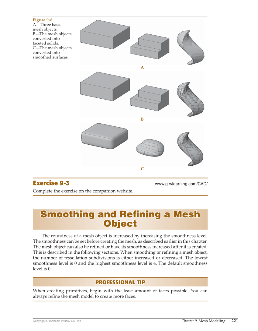 Copyright Goodheart-Willcox Co., Inc. Chapter 9 Mesh Modeling 221 Exercise 9-3 www.g-wlearning.com/CAD/ Complete the exercise on the companion website. Smoothing and Refi ning a Mesh Smoothing and Refi ning a Mesh Object Object The roundness of a mesh object is increased by increasing the smoothness level. The smoothness can be set before creating the mesh, as described earlier in this chapter. The mesh object can also be refi ned or have its smoothness increased after it is created. This is described in the following sections. When smoothing or refi ning a mesh object, the number of tessellation subdivisions is either increased or decreased. The lowest smoothness level is 0 and the highest smoothness level is 4. The default smoothness level is 0. PROFESSIONAL TIP PROFESSIONAL TIP When creating primitives, begin with the least amount of faces possible. You can always refi ne the mesh model to create more faces. A B C Figure 9-8. A—Three basic mesh objects. B—The mesh objects converted into faceted solids. C—The mesh objects converted into smoothed surfaces.