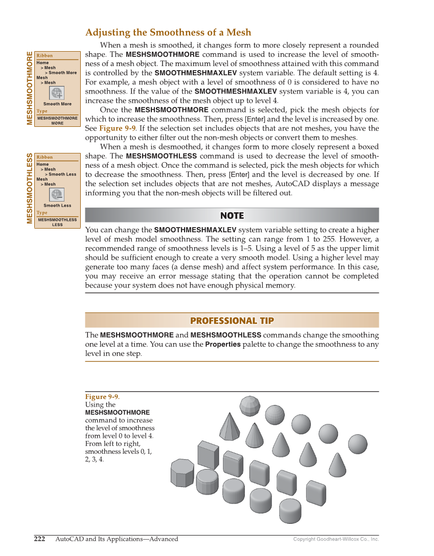 Copyright Goodheart-Willcox Co., Inc. 222 AutoCAD and Its Applications—Advanced Adjusting the Smoothness of a Mesh When a mesh is smoothed, it changes form to more closely represent a rounded shape. The MESHSMOOTHMORE command is used to increase the level of smooth- ness of a mesh object. The maximum level of smoothness attained with this command is controlled by the SMOOTHMESHMAXLEV system variable. The default setting is 4. For example, a mesh object with a level of smoothness of 0 is considered to have no smoothness. If the value of the SMOOTHMESHMAXLEV system variable is 4, you can increase the smoothness of the mesh object up to level 4. Once the MESHSMOOTHMORE command is selected, pick the mesh objects for which to increase the smoothness. Then, press [Enter] and the level is increased by one. See Figure 9-9. If the selection set includes objects that are not meshes, you have the opportunity to either fi lter out the non-mesh objects or convert them to meshes. When a mesh is desmoothed, it changes form to more closely represent a boxed shape. The MESHSMOOTHLESS command is used to decrease the level of smooth- ness of a mesh object. Once the command is selected, pick the mesh objects for which to decrease the smoothness. Then, press [Enter] and the level is decreased by one. If the selection set includes objects that are not meshes, AutoCAD displays a message informing you that the non-mesh objects will be fi ltered out. NOTE NOTE You can change the SMOOTHMESHMAXLEV system variable setting to create a higher level of mesh model smoothness. The setting can range from 1 to 255. However, a recommended range of smoothness levels is 1–5. Using a level of 5 as the upper limit should be suffi cient enough to create a very smooth model. Using a higher level may generate too many faces (a dense mesh) and affect system performance. In this case, you may receive an error message stating that the operation cannot be completed because your system does not have enough physical memory. PROFESSIONAL TIP PROFESSIONAL TIP The MESHSMOOTHMORE and MESHSMOOTHLESS commands change the smoothing one level at a time. You can use the Properties palette to change the smoothness to any level in one step. MESHSMOOTHMORE Ribbon Home Mesh Smooth More Mesh Mesh Smooth More Type MESHSMOOTHMORE MORE MESHSMOOTHLESS Ribbon Home Mesh Smooth Less Mesh Mesh Smooth Less Type MESHSMOOTHLESS LESS Figure 9-9. Using the MESHSMOOTHMORE command to increase the level of smoothness from level 0 to level 4. From left to right, smoothness levels 0, 1, 2, 3, 4.