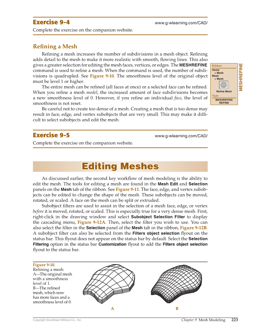 Copyright Goodheart-Willcox Co., Inc. Chapter 9 Mesh Modeling 223 Exercise 9-4 www.g-wlearning.com/CAD/ Complete the exercise on the companion website. Refi ning a Mesh Refi ning a mesh increases the number of subdivisions in a mesh object. Refi ning adds detail to the mesh to make it more realistic with smooth, fl owing lines. This also gives a greater selection for editing the mesh faces, vertices, or edges. The MESHREFINE command is used to refi ne a mesh. When the command is used, the number of subdi- visions is quadrupled. See Figure 9-10. The smoothness level of the original object must be level 1 or higher. The entire mesh can be refi ned (all faces at once) or a selected face can be refi ned. When you refi ne a mesh model, the increased amount of face subdivisions becomes a new smoothness level of 0. However, if you refi ne an individual face, the level of smoothness is not reset. Be careful not to create too dense of a mesh. Creating a mesh that is too dense may result in face, edge, and vertex subobjects that are very small. This may make it diffi - cult to select subobjects and edit the mesh. Exercise 9-5 www.g-wlearning.com/CAD/ Complete the exercise on the companion website. Editing Meshes Editing Meshes As discussed earlier, the second key workfl ow of mesh modeling is the ability to edit the mesh. The tools for editing a mesh are found in the Mesh Edit and Selection panels on the Mesh tab of the ribbon. See Figure 9-11. The face, edge, and vertex subob- jects can be edited to change the shape of the mesh. These subobjects can be moved, rotated, or scaled. A face on the mesh can be split or extruded. Subobject fi lters are used to assist in the selection of a mesh face, edge, or vertex before it is moved, rotated, or scaled. This is especially true for a very dense mesh. First, right-click in the drawing window and select Subobject Selection Filter to display the cascading menu, Figure 9-12A. Then, select the fi lter you wish to use. You can also select the fi lter in the Selection panel of the Mesh tab in the ribbon, Figure 9-12B. A subobject fi lter can also be selected from the Filters object selection fl yout on the status bar. This fl yout does not appear on the status bar by default. Select the Selection Filtering option in the status bar Customization fl yout to add the Filters object selection fl yout to the status bar. MESHREFINE Ribbon Home Mesh Mesh Mesh Refine Mesh Type MESHREFINE REFINE A B Figure 9-10. Refining a mesh. A—The original mesh with a smoothness level of 1. B—The refined mesh, which now has more faces and a smoothness level of 0.