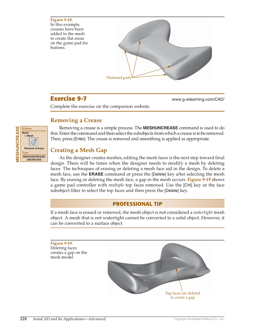 Copyright Goodheart-Willcox Co., Inc. 228 AutoCAD and Its Applications—Advanced Exercise 9-7 www.g-wlearning.com/CAD/ Complete the exercise on the companion website. Removing a Crease Removing a crease is a simple process. The MESHUNCREASE command is used to do this. Enter the command and then select the subobjects from which a crease is to be removed. Then, press [Enter]. The crease is removed and smoothing is applied as appropriate. Creating a Mesh Gap As the designer creates meshes, editing the mesh faces is the next step toward fi nal design. There will be times when the designer needs to modify a mesh by deleting faces. The techniques of erasing or deleting a mesh face aid in the design. To delete a mesh face, use the ERASE command or press the [Delete] key after selecting the mesh face. By erasing or deleting the mesh face, a gap in the mesh occurs. Figure 9-19 shows a game pad controller with multiple top faces removed. Use the [Ctrl] key or the face subobject fi lter to select the top faces and then press the [Delete] key. PROFESSIONAL TIP PROFESSIONAL TIP If a mesh face is erased or removed, the mesh object is not considered a watertight mesh object. A mesh that is not watertight cannot be converted to a solid object. However, it can be converted to a surface object. MESHUNCREASE Ribbon Mesh Mesh Remove Crease Type MESHUNCREASE UNCREASE Top faces are deleted to create a gap Figure 9-19. Deleting faces creates a gap on the mesh model. Flattened pads Figure 9-18. In this example, creases have been added to the mesh to create flat areas on the game pad for buttons.