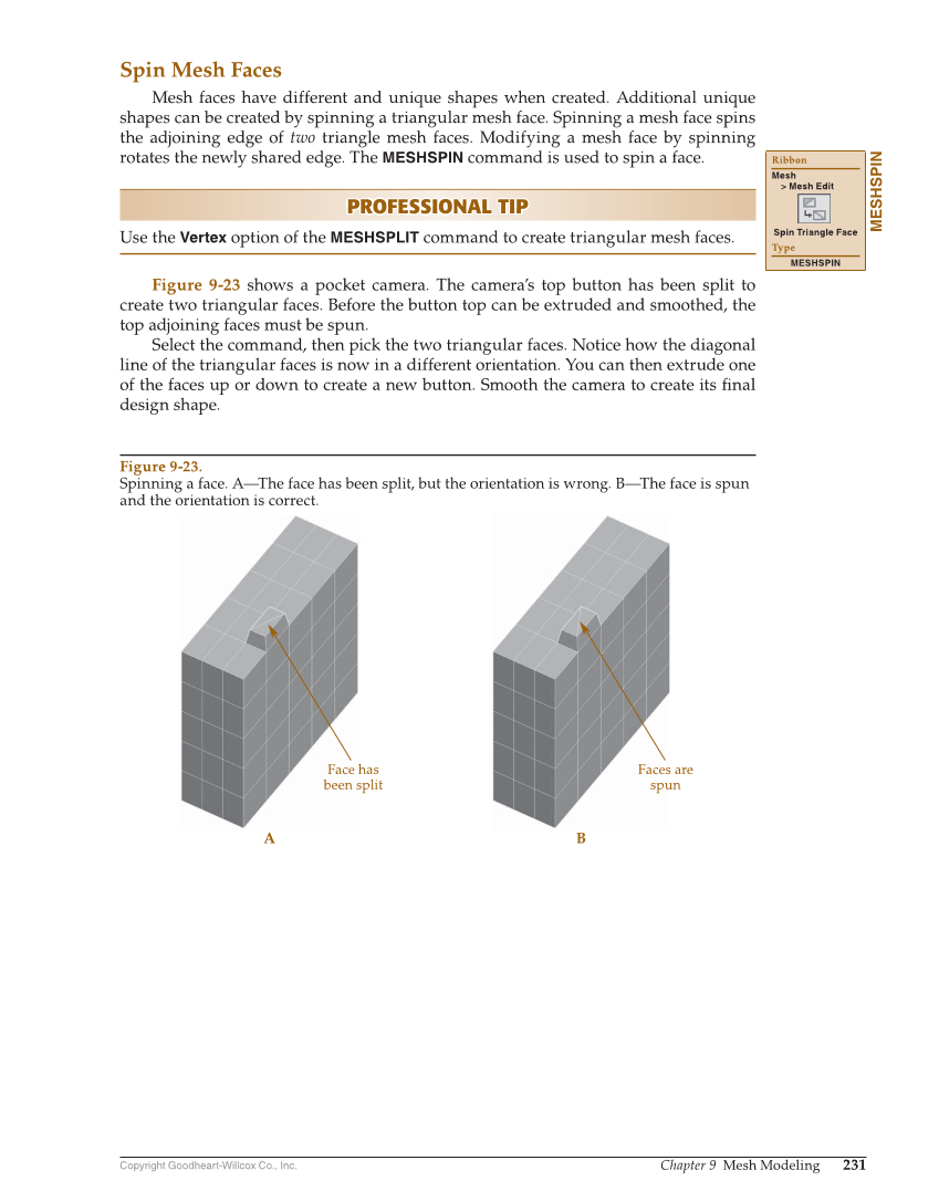 Copyright Goodheart-Willcox Co., Inc. Chapter 9 Mesh Modeling 231 Spin Mesh Faces Mesh faces have different and unique shapes when created. Additional unique shapes can be created by spinning a triangular mesh face. Spinning a mesh face spins the adjoining edge of two triangle mesh faces. Modifying a mesh face by spinning rotates the newly shared edge. The MESHSPIN command is used to spin a face. PROFESSIONAL TIP PROFESSIONAL TIP Use the Vertex option of the MESHSPLIT command to create triangular mesh faces. Figure 9-23 shows a pocket camera. The camera’s top button has been split to create two triangular faces. Before the button top can be extruded and smoothed, the top adjoining faces must be spun. Select the command, then pick the two triangular faces. Notice how the diagonal line of the triangular faces is now in a different orientation. You can then extrude one of the faces up or down to create a new button. Smooth the camera to create its fi nal design shape. MESHSPIN Ribbon Mesh Mesh Edit Spin Triangle Face Type MESHSPIN Figure 9-23. Spinning a face. A—The face has been split, but the orientation is wrong. B—The face is spun and the orientation is correct. Face has been split Faces are spun A B