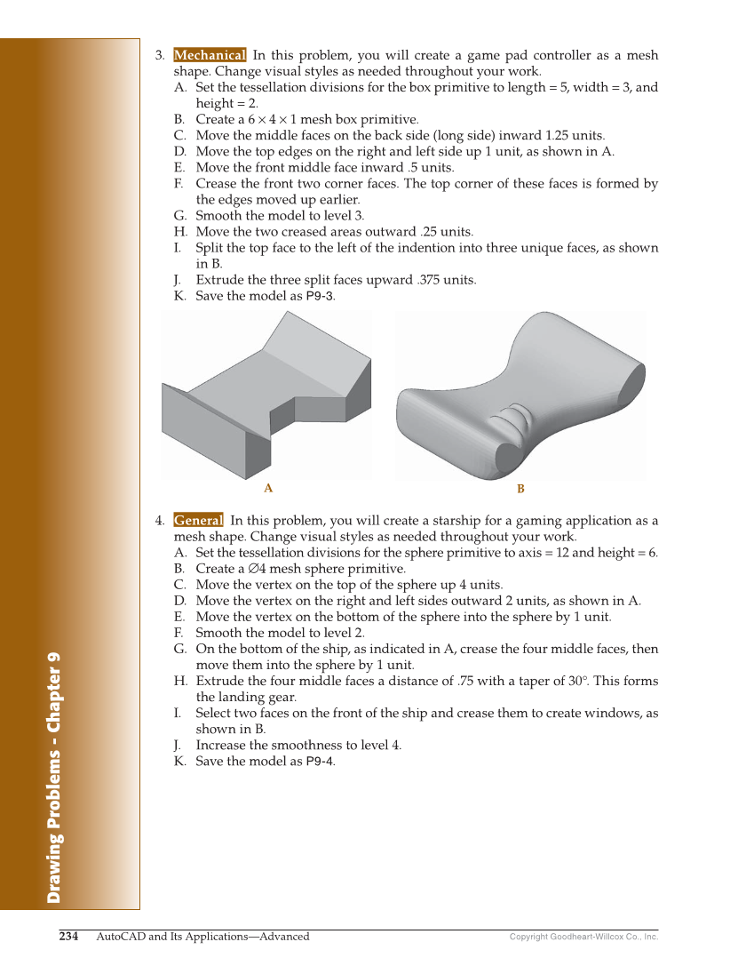 Drawing Problems - Chapter 9 Copyright Goodheart-Willcox Co., Inc. 234 AutoCAD and Its Applications—Advanced 3. Mechanical In this problem, you will create a game pad controller as a mesh shape. Change visual styles as needed throughout your work. A. Set the tessellation divisions for the box primitive to length = 5, width = 3, and height = 2. B. Create a 6 × 4 × 1 mesh box primitive. C. Move the middle faces on the back side (long side) inward 1.25 units. D. Move the top edges on the right and left side up 1 unit, as shown in A. E. Move the front middle face inward .5 units. F. Crease the front two corner faces. The top corner of these faces is formed by the edges moved up earlier. G. Smooth the model to level 3. H. Move the two creased areas outward .25 units. I. Split the top face to the left of the indention into three unique faces, as shown in B. J. Extrude the three split faces upward .375 units. K. Save the model as P9-3. 4. General In this problem, you will create a starship for a gaming application as a mesh shape. Change visual styles as needed throughout your work. A. Set the tessellation divisions for the sphere primitive to axis = 12 and height = 6. B. Create a ∅4 mesh sphere primitive. C. Move the vertex on the top of the sphere up 4 units. D. Move the vertex on the right and left sides outward 2 units, as shown in A. E. Move the vertex on the bottom of the sphere into the sphere by 1 unit. F. Smooth the model to level 2. G. On the bottom of the ship, as indicated in A, crease the four middle faces, then move them into the sphere by 1 unit. H. Extrude the four middle faces a distance of .75 with a taper of 30°. This forms the landing gear. I. Select two faces on the front of the ship and crease them to create windows, as shown in B. J. Increase the smoothness to level 4. K. Save the model as P9-4. A B