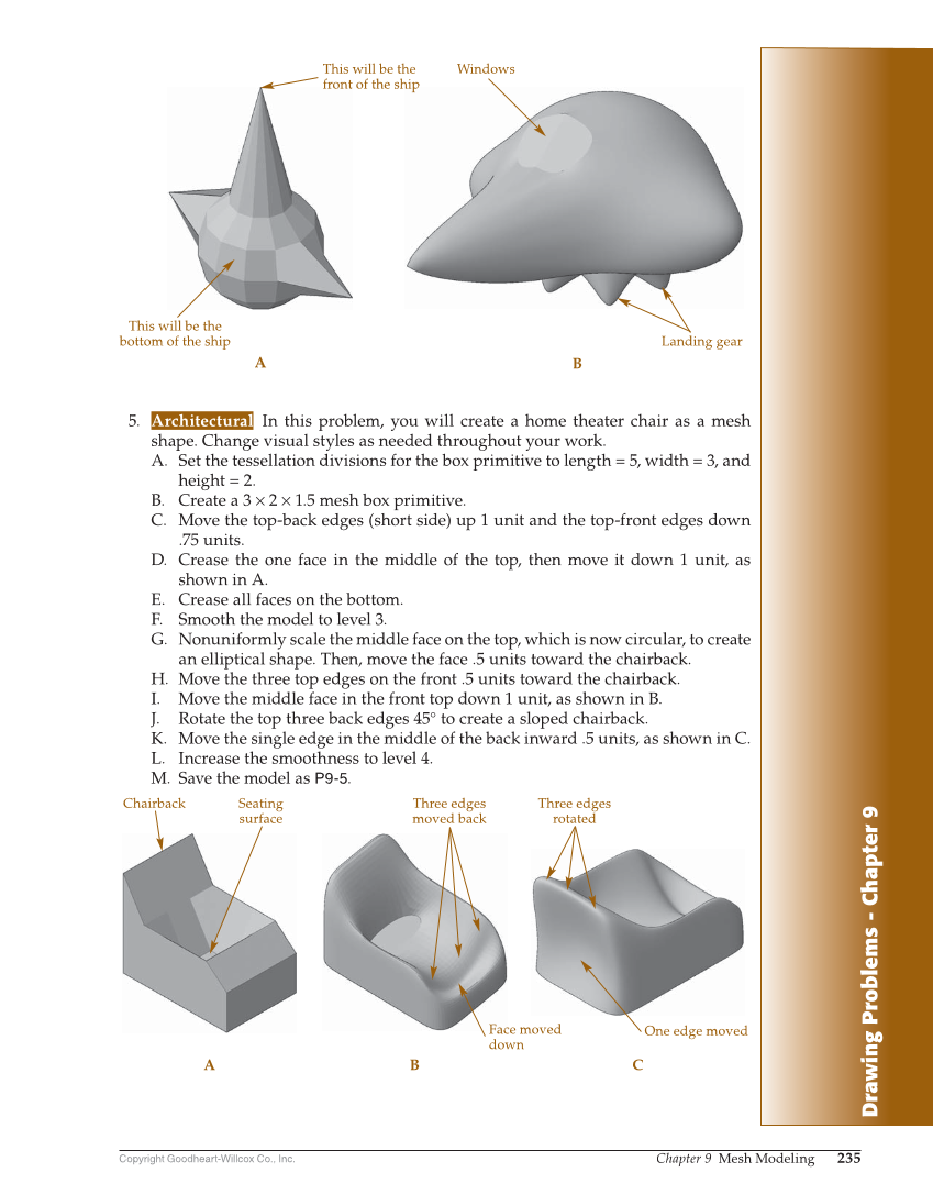 Drawing Problems - Chapter 9 Copyright Goodheart-Willcox Co., Inc. Chapter 9 Mesh Modeling 235 5. Architectural In this problem, you will create a home theater chair as a mesh shape. Change visual styles as needed throughout your work. A. Set the tessellation divisions for the box primitive to length = 5, width = 3, and height = 2. B. Create a 3 × 2 × 1.5 mesh box primitive. C. Move the top-back edges (short side) up 1 unit and the top-front edges down .75 units. D. Crease the one face in the middle of the top, then move it down 1 unit, as shown in A. E. Crease all faces on the bottom. F. Smooth the model to level 3. G. Nonuniformly scale the middle face on the top, which is now circular, to create an elliptical shape. Then, move the face .5 units toward the chairback. H. Move the three top edges on the front .5 units toward the chairback. I. Move the middle face in the front top down 1 unit, as shown in B. J. Rotate the top three back edges 45° to create a sloped chairback. K. Move the single edge in the middle of the back inward .5 units, as shown in C. L. Increase the smoothness to level 4. M. Save the model as P9-5. A B This will be the front of the ship Windows This will be the bottom of the ship Landing gear Chairback Seating surface Three edges moved back Face moved down One edge moved Three edges rotated A B C