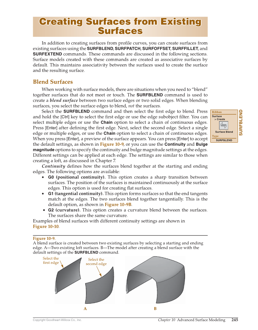 Copyright Goodheart-Willcox Co., Inc. Chapter 10 Advanced Surface Modeling 245 Creating Surfaces from Existing Creating Surfaces from Existing Surfaces Surfaces In addition to creating surfaces from profi le curves, you can create surfaces from existing surfaces using the SURFBLEND, SURFPATCH, SURFOFFSET, SURFFILLET, and SURFEXTEND commands. These commands are discussed in the following sections. Surface models created with these commands are created as associative surfaces by default. This maintains associativity between the surfaces used to create the surface and the resulting surface. Blend Surfaces When working with surface models, there are situations when you need to “blend” together surfaces that do not meet or touch. The SURFBLEND command is used to create a blend surface between two surface edges or two solid edges. When blending surfaces, you select the surface edges to blend, not the surfaces. Select the SURFBLEND command and then select the fi rst edge to blend. Press and hold the [Ctrl] key to select the fi rst edge or use the edge subobject fi lter. You can select multiple edges or use the Chain option to select a chain of continuous edges. Press [Enter] after defi ning the fi rst edge. Next, select the second edge. Select a single edge or multiple edges, or use the Chain option to select a chain of continuous edges. When you press [Enter], a preview of the surface appears. You can press [Enter] to accept the default settings, as shown in Figure 10-9, or you can use the Continuity and Bulge magnitude options to specify the continuity and bulge magnitude settings at the edges. Different settings can be applied at each edge. The settings are similar to those when creating a loft, as discussed in Chapter 7. Continuity defi nes how the surfaces blend together at the starting and ending edges. The following options are available: • G0 (positional continuity). This option creates a sharp transition between surfaces. The position of the surfaces is maintained continuously at the surface edges. This option is used for creating fl at surfaces. • G1 (tangential continuity). This option forms surfaces so that the end tangents match at the edges. The two surfaces blend together tangentially. This is the default option, as shown in Figure 10-9B. • G2 (curvature). This option creates a curvature blend between the surfaces. The surfaces share the same curvature. Examples of blend surfaces with different continuity settings are shown in Figure 10-10. SURFBLEND Ribbon Surface Create Surface Blend Type SURFBLEND Select the first edge A B Select the second edge Figure 10-9. A blend surface is created between two existing surfaces by selecting a starting and ending edge. A—Two existing loft surfaces. B—The model after creating a blend surface with the default settings of the SURFBLEND command.