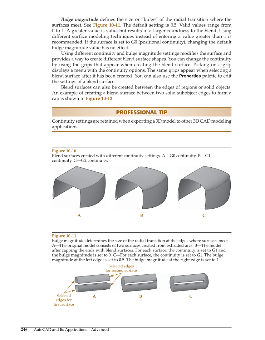 246 AutoCAD and Its Applications—Advanced 246 AutoCAD and Its Applications—Advanced Bulge magnitude defi nes the size or “bulge” of the radial transition where the surfaces meet. See Figure 10-11. The default setting is 0.5. Valid values range from 0 to 1. A greater value is valid, but results in a larger roundness to the blend. Using different surface modeling techniques instead of entering a value greater than 1 is recommended. If the surface is set to G0 (positional continuity), changing the default bulge magnitude value has no effect. Using different continuity and bulge magnitude settings modifi es the surface and provides a way to create different blend surface shapes. You can change the continuity by using the grips that appear when creating the blend surface. Picking on a grip displays a menu with the continuity options. The same grips appear when selecting a blend surface after it has been created. You can also use the Properties palette to edit the settings of a blend surface. Blend surfaces can also be created between the edges of regions or solid objects. An example of creating a blend surface between two solid subobject edges to form a cap is shown in Figure 10-12. PROFESSIONAL TIP PROFESSIONAL TIP Continuity settings are retained when exporting a 3D model to other 3D CAD modeling applications. A B C Selected edges for second surface Selected edges for first surface A B C Figure 10-10. Blend surfaces created with different continuity settings. A—G0 continuity. B—G1 continuity. C—G2 continuity. Figure 10-11. Bulge magnitude determines the size of the radial transition at the edges where surfaces meet. A—The original model consists of two surfaces created from extruded arcs. B—The model after capping the ends with blend surfaces. For each surface, the continuity is set to G1 and the bulge magnitude is set to 0. C—For each surface, the continuity is set to G1. The bulge magnitude at the left edge is set to 0.5. The bulge magnitude at the right edge is set to 1.