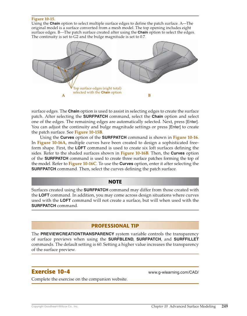 Copyright Goodheart-Willcox Co., Inc. Chapter 10 Advanced Surface Modeling 249 surface edges. The Chain option is used to assist in selecting edges to create the surface patch. After selecting the SURFPATCH command, select the Chain option and select one of the edges. The remaining edges are automatically selected. Next, press [Enter]. You can adjust the continuity and bulge magnitude settings or press [Enter] to create the patch surface. See Figure 10-15B. Using the Curves option of the SURFPATCH command is shown in Figure 10-16. In Figure 10-16A, multiple curves have been created to design a sophisticated free- form shape. First, the LOFT command is used to create six loft surfaces defi ning the sides. Refer to the shaded surfaces shown in Figure 10-16B. Then, the Curves option of the SURFPATCH command is used to create three surface patches forming the top of the model. Refer to Figure 10-16C. To use the Curves option, enter it after selecting the SURFPATCH command. Then, select the curves defi ning the patch surface. NOTE NOTE Surfaces created using the SURFPATCH command may differ from those created with the LOFT command. In addition, you may come across design situations where curves used with the LOFT command will not create a surface, but will when used with the SURFPATCH command. PROFESSIONAL TIP PROFESSIONAL TIP The PREVIEWCREATIONTRANSPARENCY system variable controls the transparency of surface previews when using the SURFBLEND, SURFPATCH, and SURFFILLET commands. The default setting is 60. Setting a higher value increases the transparency of the surface preview. Exercise 10-4 www.g-wlearning.com/CAD/ Complete the exercise on the companion website. A B Top surface edges (eight total) selected with the Chain option Figure 10-15. Using the Chain option to select multiple surface edges to define the patch surface. A—The original model is a surface converted from a mesh model. The top opening includes eight surface edges. B—The patch surface created after using the Chain option to select the edges. The continuity is set to G2 and the bulge magnitude is set to 0.7.