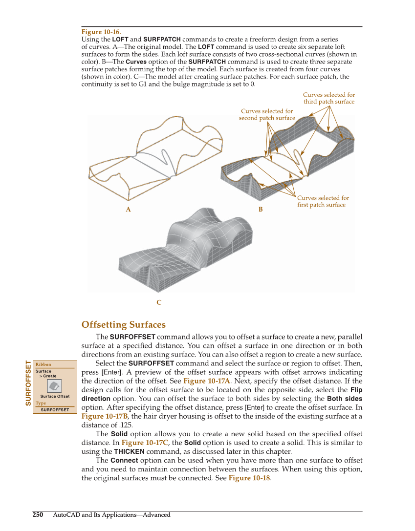 250 AutoCAD and Its Applications—Advanced 250 AutoCAD and Its Applications—Advanced Offsetting Surfaces The SURFOFFSET command allows you to offset a surface to create a new, parallel surface at a specifi ed distance. You can offset a surface in one direction or in both directions from an existing surface. You can also offset a region to create a new surface. Select the SURFOFFSET command and select the surface or region to offset. Then, press [Enter]. A preview of the offset surface appears with offset arrows indicating the direction of the offset. See Figure 10-17A. Next, specify the offset distance. If the design calls for the offset surface to be located on the opposite side, select the Flip direction option. You can offset the surface to both sides by selecting the Both sides option. After specifying the offset distance, press [Enter] to create the offset surface. In Figure 10-17B, the hair dryer housing is offset to the inside of the existing surface at a distance of .125. The Solid option allows you to create a new solid based on the specifi ed offset distance. In Figure 10-17C, the Solid option is used to create a solid. This is similar to using the THICKEN command, as discussed later in this chapter. The Connect option can be used when you have more than one surface to offset and you need to maintain connection between the surfaces. When using this option, the original surfaces must be connected. See Figure 10-18. SURFOFFSET Ribbon Surface Create Surface Offset Type SURFOFFSET A B C Curves selected for third patch surface Curves selected for first patch surface Curves selected for second patch surface Figure 10-16. Using the LOFT and SURFPATCH commands to create a freeform design from a series of curves. A—The original model. The LOFT command is used to create six separate loft surfaces to form the sides. Each loft surface consists of two cross-sectional curves (shown in color). B—The Curves option of the SURFPATCH command is used to create three separate surface patches forming the top of the model. Each surface is created from four curves (shown in color). C—The model after creating surface patches. For each surface patch, the continuity is set to G1 and the bulge magnitude is set to 0.