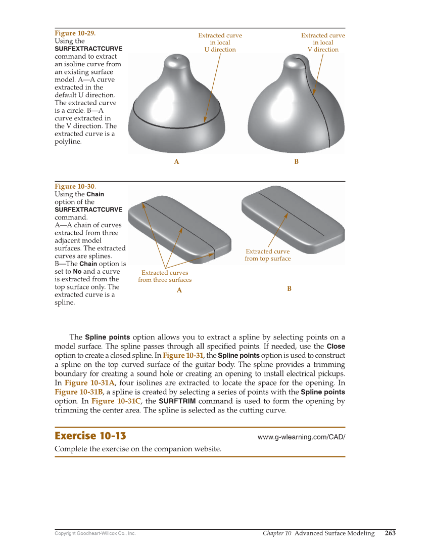 Copyright Goodheart-Willcox Co., Inc. Chapter 10 Advanced Surface Modeling 263 The Spline points option allows you to extract a spline by selecting points on a model surface. The spline passes through all specifi ed points. If needed, use the Close option to create a closed spline. In Figure 10-31, the Spline points option is used to construct a spline on the top curved surface of the guitar body. The spline provides a trimming boundary for creating a sound hole or creating an opening to install electrical pickups. In Figure 10-31A, four isolines are extracted to locate the space for the opening. In Figure 10-31B, a spline is created by selecting a series of points with the Spline points option. In Figure 10-31C, the SURFTRIM command is used to form the opening by trimming the center area. The spline is selected as the cutting curve. Exercise 10-13 www.g-wlearning.com/CAD/ Complete the exercise on the companion website. Extracted curve in local U direction Extracted curve in local V direction A B Figure 10-29. Using the SURFEXTRACTCURVE command to extract an isoline curve from an existing surface model. A—A curve extracted in the default U direction. The extracted curve is a circle. B—A curve extracted in the V direction. The extracted curve is a polyline. Extracted curve from top surface A B Extracted curves from three surfaces Figure 10-30. Using the Chain option of the SURFEXTRACTCURVE command. A—A chain of curves extracted from three adjacent model surfaces. The extracted curves are splines. B—The Chain option is set to No and a curve is extracted from the top surface only. The extracted curve is a spline.