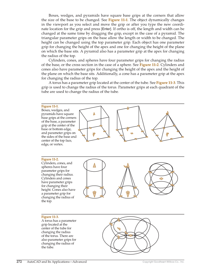 Copyright Goodheart-Willcox Co., Inc. 272 AutoCAD and Its Applications—Advanced Boxes, wedges, and pyramids have square base grips at the corners that allow the size of the base to be changed. See Figure 11-1. The object dynamically changes in the viewport as you select and move the grip or after you type the new coordi- nate location for the grip and press [Enter]. If ortho is off, the length and width can be changed at the same time by dragging the grip, except in the case of a pyramid. The triangular parameter grips on the base allow the length or width to be changed. The height can be changed using the top parameter grip. Each object has one parameter grip for changing the height of the apex and one for changing the height of the plane on which the base sits. A pyramid also has a parameter grip at the apex for changing the radius of the top. Cylinders, cones, and spheres have four parameter grips for changing the radius of the base, or the cross section in the case of a sphere. See Figure 11-2. Cylinders and cones also have parameter grips for changing the height of the apex and the height of the plane on which the base sits. Additionally, a cone has a parameter grip at the apex for changing the radius of the top. A torus has a parameter grip located at the center of the tube. See Figure 11-3. This grip is used to change the radius of the torus. Parameter grips at each quadrant of the tube are used to change the radius of the tube. Figure 11-1. Boxes, wedges, and pyramids have square base grips at the corners of the base, a parameter grip at the center of the base or bottom edge, and parameter grips on the sides of the base and center of the top face, edge, or vertex. Figure 11-2. Cylinders, cones, and spheres have four parameter grips for changing their radius. Cylinders and cones have parameter grips for changing their height. Cones also have a parameter grip for changing the radius of the top. Figure 11-3. A torus has a parameter grip located at the center of the tube for changing the radius of the torus. There are also parameter grips for changing the radius of the tube.