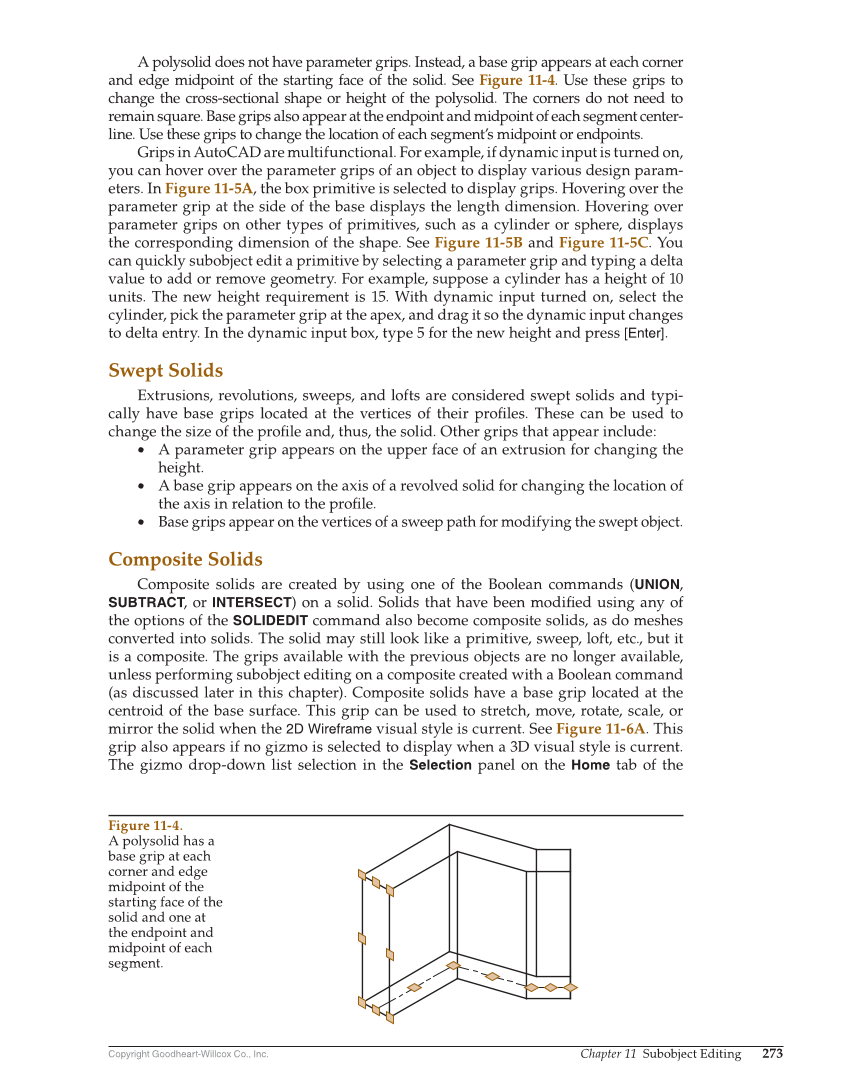 Copyright Goodheart-Willcox Co., Inc. Chapter 11 Subobject Editing 273 A polysolid does not have parameter grips. Instead, a base grip appears at each corner and edge midpoint of the starting face of the solid. See Figure 11-4. Use these grips to change the cross-sectional shape or height of the polysolid. The corners do not need to remain square. Base grips also appear at the endpoint and midpoint of each segment center- line. Use these grips to change the location of each segment’s midpoint or endpoints. Grips in AutoCAD are multifunctional. For example, if dynamic input is turned on, you can hover over the parameter grips of an object to display various design param- eters. In Figure 11-5A, the box primitive is selected to display grips. Hovering over the parameter grip at the side of the base displays the length dimension. Hovering over parameter grips on other types of primitives, such as a cylinder or sphere, displays the corresponding dimension of the shape. See Figure 11-5B and Figure 11-5C. You can quickly subobject edit a primitive by selecting a parameter grip and typing a delta value to add or remove geometry. For example, suppose a cylinder has a height of 10 units. The new height requirement is 15. With dynamic input turned on, select the cylinder, pick the parameter grip at the apex, and drag it so the dynamic input changes to delta entry. In the dynamic input box, type 5 for the new height and press [Enter]. Swept Solids Extrusions, revolutions, sweeps, and lofts are considered swept solids and typi- cally have base grips located at the vertices of their profi les. These can be used to change the size of the profi le and, thus, the solid. Other grips that appear include: • A parameter grip appears on the upper face of an extrusion for changing the height. • A base grip appears on the axis of a revolved solid for changing the location of the axis in relation to the profi le. • Base grips appear on the vertices of a sweep path for modifying the swept object. Composite Solids Composite solids are created by using one of the Boolean commands (UNION, SUBTRACT, or INTERSECT) on a solid. Solids that have been modifi ed using any of the options of the SOLIDEDIT command also become composite solids, as do meshes converted into solids. The solid may still look like a primitive, sweep, loft, etc., but it is a composite. The grips available with the previous objects are no longer available, unless performing subobject editing on a composite created with a Boolean command (as discussed later in this chapter). Composite solids have a base grip located at the centroid of the base surface. This grip can be used to stretch, move, rotate, scale, or mirror the solid when the 2D Wireframe visual style is current. See Figure 11-6A. This grip also appears if no gizmo is selected to display when a 3D visual style is current. The gizmo drop-down list selection in the Selection panel on the Home tab of the Figure 11-4. A polysolid has a base grip at each corner and edge midpoint of the starting face of the solid and one at the endpoint and midpoint of each segment.