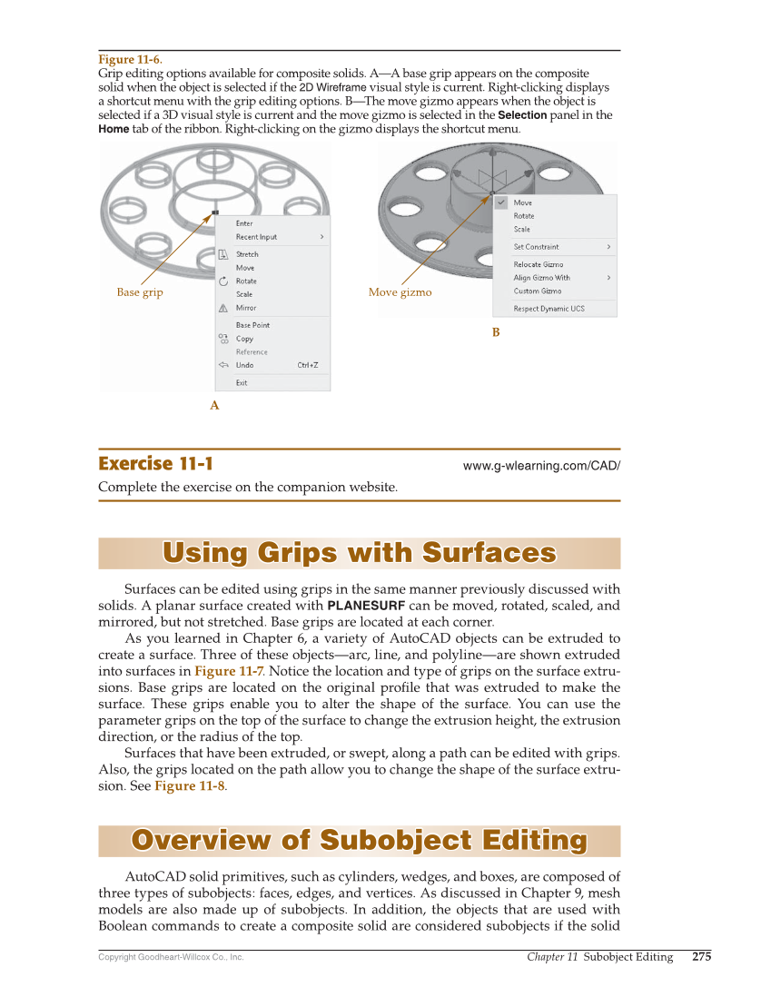 Copyright Goodheart-Willcox Co., Inc. Chapter 11 Subobject Editing 275 Exercise 11-1 www.g-wlearning.com/CAD/ Complete the exercise on the companion website. Using Grips with Surfaces Using Grips with Surfaces Surfaces can be edited using grips in the same manner previously discussed with solids. A planar surface created with PLANESURF can be moved, rotated, scaled, and mirrored, but not stretched. Base grips are located at each corner. As you learned in Chapter 6, a variety of AutoCAD objects can be extruded to create a surface. Three of these objects—arc, line, and polyline—are shown extruded into surfaces in Figure 11-7. Notice the location and type of grips on the surface extru- sions. Base grips are located on the original profi le that was extruded to make the surface. These grips enable you to alter the shape of the surface. You can use the parameter grips on the top of the surface to change the extrusion height, the extrusion direction, or the radius of the top. Surfaces that have been extruded, or swept, along a path can be edited with grips. Also, the grips located on the path allow you to change the shape of the surface extru- sion. See Figure 11-8. Overview of Subobject Editing Overview of Subobject Editing AutoCAD solid primitives, such as cylinders, wedges, and boxes, are composed of three types of subobjects: faces, edges, and vertices. As discussed in Chapter 9, mesh models are also made up of subobjects. In addition, the objects that are used with Boolean commands to create a composite solid are considered subobjects if the solid A B Base grip Move gizmo Figure 11-6. Grip editing options available for composite solids. A—A base grip appears on the composite solid when the object is selected if the 2D Wireframe visual style is current. Right-clicking displays a shortcut menu with the grip editing options. B—The move gizmo appears when the object is selected if a 3D visual style is current and the move gizmo is selected in the Selection panel in the Home tab of the ribbon. Right-clicking on the gizmo displays the shortcut menu.