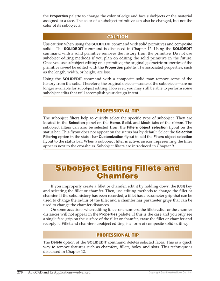 Copyright Goodheart-Willcox Co., Inc. 278 AutoCAD and Its Applications—Advanced the Properties palette to change the color of edge and face subobjects or the material assigned to a face. The color of a subobject primitive can also be changed, but not the color of its subobjects. CAUTION CAUTION Use caution when using the SOLIDEDIT command with solid primitives and composite solids. The SOLIDEDIT command is discussed in Chapter 12. Using the SOLIDEDIT command with a solid primitive removes the history from the primitive. Do not use subobject editing methods if you plan on editing the solid primitive in the future. Once you use subobject editing on a primitive, the original geometric properties of the primitive cannot be edited with the Properties palette. The associated properties, such as the length, width, or height, are lost. Using the SOLIDEDIT command with a composite solid may remove some of the history from the solid. Therefore, the original objects—some of the subobjects—are no longer available for subobject editing. However, you may still be able to perform some subobject edits that will accomplish your design intent. PROFESSIONAL TIP PROFESSIONAL TIP The subobject fi lters help to quickly select the specifi c type of subobject. They are located in the Selection panel on the Home, Solid, and Mesh tabs of the ribbon. The subobject fi lters can also be selected from the Filters object selection fl yout on the status bar. This fl yout does not appear on the status bar by default. Select the Selection Filtering option in the status bar Customization fl yout to add the Filters object selection fl yout to the status bar. When a subobject fi lter is active, an icon representing the fi lter appears next to the crosshairs. Subobject fi lters are introduced in Chapter 9. Subobject Editing Fillets and Subobject Editing Fillets and Chamfers Chamfers If you improperly create a fi llet or chamfer, edit it by holding down the [Ctrl] key and selecting the fi llet or chamfer. Then, use editing methods to change the fi llet or chamfer. If the solid history has been recorded, a fi llet has a parameter grip that can be used to change the radius of the fi llet and a chamfer has parameter grips that can be used to change the chamfer distances. On some occasions when editing fi llets or chamfers, the fi llet radius or the chamfer distances will not appear in the Properties palette. If this is the case and you only see a single face grip on the surface of the fi llet or chamfer, erase the fi llet or chamfer and reapply it. Fillet and chamfer subobject editing is a form of composite solid editing. PROFESSIONAL TIP PROFESSIONAL TIP The Delete option of the SOLIDEDIT command deletes selected faces. This is a quick way to remove features such as chamfers, fi llets, holes, and slots. This technique is discussed in Chapter 12.
