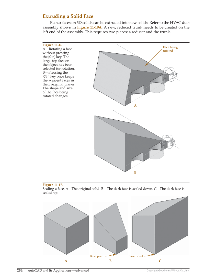 Copyright Goodheart-Willcox Co., Inc. 284 AutoCAD and Its Applications—Advanced Extruding a Solid Face Planar faces on 3D solids can be extruded into new solids. Refer to the HVAC duct assembly shown in Figure 11-19A. A new, reduced trunk needs to be created on the left end of the assembly. This requires two pieces: a reducer and the trunk. Base point C A B Base point A B Face being rotated Figure 11-16. A—Rotating a face without pressing the [Ctrl] key. The large, top face on the object has been selected for rotation. B—Pressing the [Ctrl] key once keeps the adjacent faces in their original planes. The shape and size of the face being rotated changes. Figure 11-17. Scaling a face. A—The original solid. B—The dark face is scaled down. C—The dark face is scaled up.