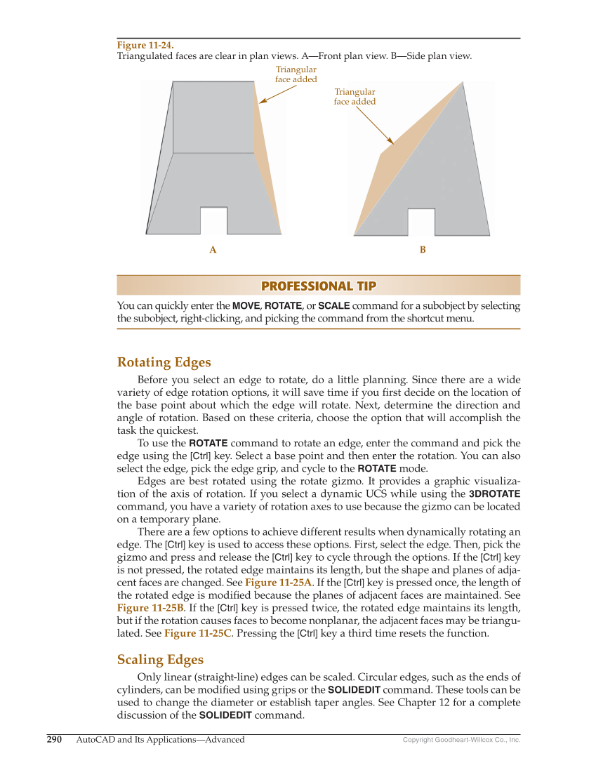 Copyright Goodheart-Willcox Co., Inc. 290 AutoCAD and Its Applications—Advanced PROFESSIONAL TIP PROFESSIONAL TIP You can quickly enter the MOVE, ROTATE, or SCALE command for a subobject by selecting the subobject, right-clicking, and picking the command from the shortcut menu. Rotating Edges Before you select an edge to rotate, do a little planning. Since there are a wide variety of edge rotation options, it will save time if you fi rst decide on the location of the base point about which the edge will rotate. Next, determine the direction and angle of rotation. Based on these criteria, choose the option that will accomplish the task the quickest. To use the ROTATE command to rotate an edge, enter the command and pick the edge using the [Ctrl] key. Select a base point and then enter the rotation. You can also select the edge, pick the edge grip, and cycle to the ROTATE mode. Edges are best rotated using the rotate gizmo. It provides a graphic visualiza- tion of the axis of rotation. If you select a dynamic UCS while using the 3DROTATE command, you have a variety of rotation axes to use because the gizmo can be located on a temporary plane. There are a few options to achieve different results when dynamically rotating an edge. The [Ctrl] key is used to access these options. First, select the edge. Then, pick the gizmo and press and release the [Ctrl] key to cycle through the options. If the [Ctrl] key is not pressed, the rotated edge maintains its length, but the shape and planes of adja- cent faces are changed. See Figure 11-25A. If the [Ctrl] key is pressed once, the length of the rotated edge is modifi ed because the planes of adjacent faces are maintained. See Figure 11-25B. If the [Ctrl] key is pressed twice, the rotated edge maintains its length, but if the rotation causes faces to become nonplanar, the adjacent faces may be triangu- lated. See Figure 11-25C. Pressing the [Ctrl] key a third time resets the function. Scaling Edges Only linear (straight-line) edges can be scaled. Circular edges, such as the ends of cylinders, can be modifi ed using grips or the SOLIDEDIT command. These tools can be used to change the diameter or establish taper angles. See Chapter 12 for a complete discussion of the SOLIDEDIT command. A B Triangular face added Triangular face added Figure 11-24. Triangulated faces are clear in plan views. A—Front plan view. B—Side plan view.