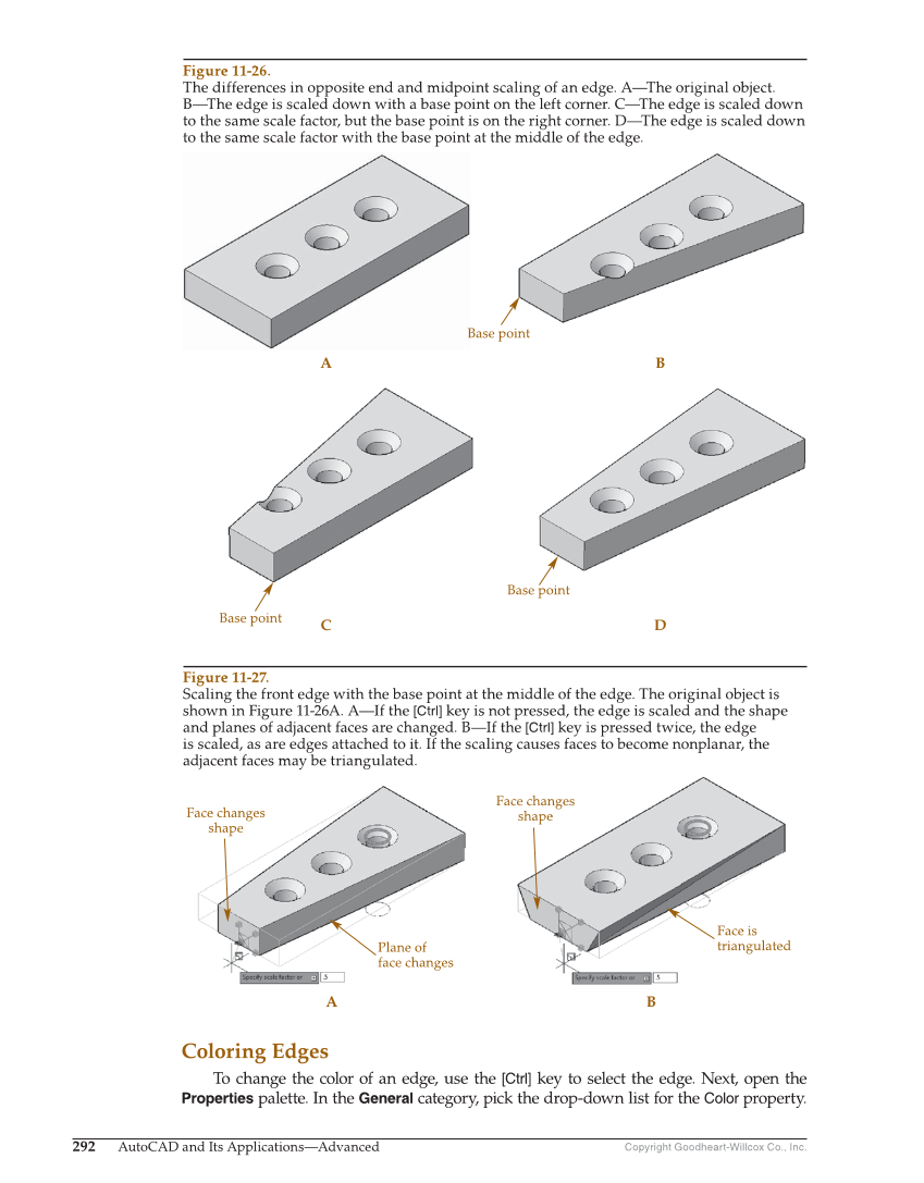 Copyright Goodheart-Willcox Co., Inc. 292 AutoCAD and Its Applications—Advanced Coloring Edges To change the color of an edge, use the [Ctrl] key to select the edge. Next, open the Properties palette. In the General category, pick the drop-down list for the Color property. Base point A B C D Base point Base point A B Face is triangulated Plane of face changes Face changes shape Face changes shape Figure 11-26. The differences in opposite end and midpoint scaling of an edge. A—The original object. B—The edge is scaled down with a base point on the left corner. C—The edge is scaled down to the same scale factor, but the base point is on the right corner. D—The edge is scaled down to the same scale factor with the base point at the middle of the edge. Figure 11-27. Scaling the front edge with the base point at the middle of the edge. The original object is shown in Figure 11-26A. A—If the [Ctrl] key is not pressed, the edge is scaled and the shape and planes of adjacent faces are changed. B—If the [Ctrl] key is pressed twice, the edge is scaled, as are edges attached to it. If the scaling causes faces to become nonplanar, the adjacent faces may be triangulated.