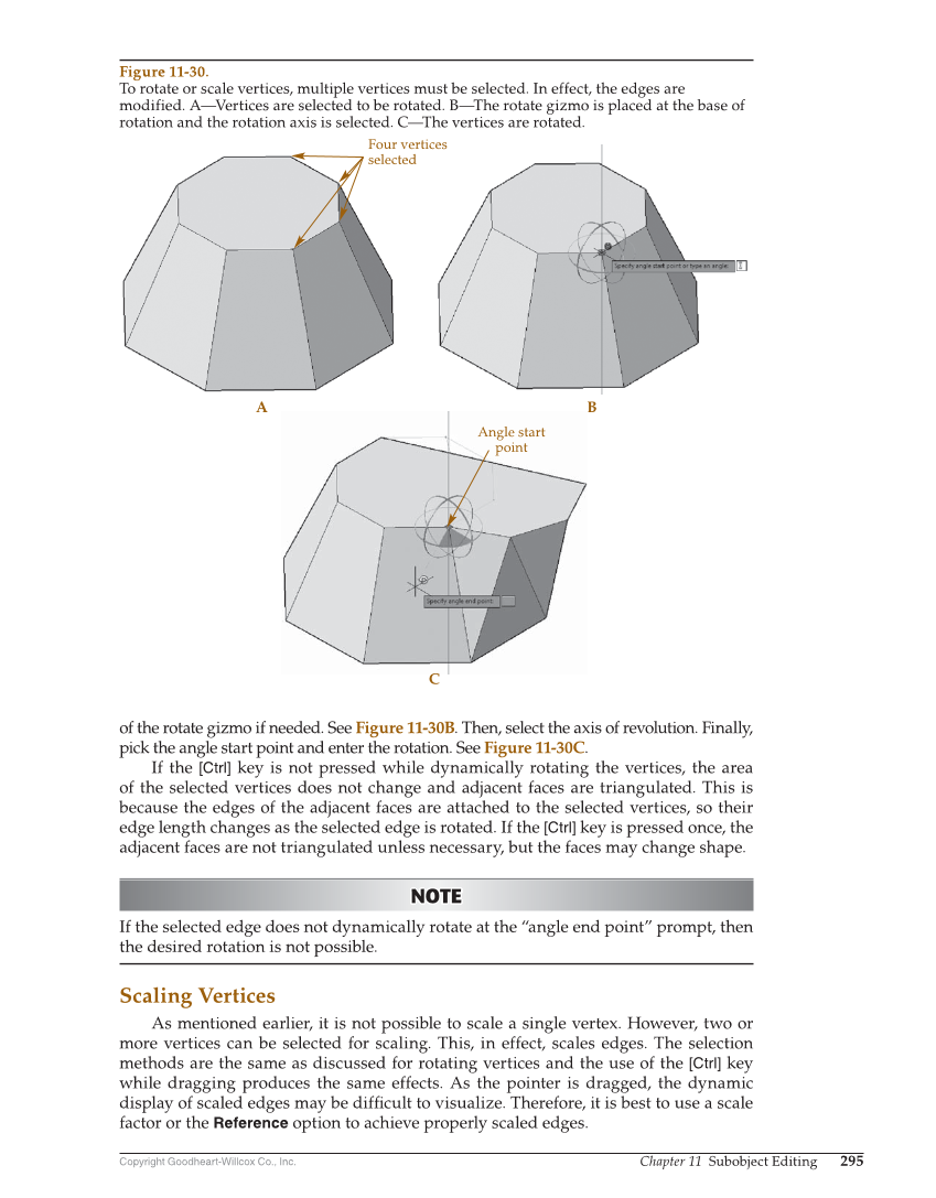 Copyright Goodheart-Willcox Co., Inc. Chapter 11 Subobject Editing 295 of the rotate gizmo if needed. See Figure 11-30B. Then, select the axis of revolution. Finally, pick the angle start point and enter the rotation. See Figure 11-30C. If the [Ctrl] key is not pressed while dynamically rotating the vertices, the area of the selected vertices does not change and adjacent faces are triangulated. This is because the edges of the adjacent faces are attached to the selected vertices, so their edge length changes as the selected edge is rotated. If the [Ctrl] key is pressed once, the adjacent faces are not triangulated unless necessary, but the faces may change shape. NOTE NOTE If the selected edge does not dynamically rotate at the “angle end point” prompt, then the desired rotation is not possible. Scaling Vertices As mentioned earlier, it is not possible to scale a single vertex. However, two or more vertices can be selected for scaling. This, in effect, scales edges. The selection methods are the same as discussed for rotating vertices and the use of the [Ctrl] key while dragging produces the same effects. As the pointer is dragged, the dynamic display of scaled edges may be diffi cult to visualize. Therefore, it is best to use a scale factor or the Reference option to achieve properly scaled edges. Angle start point Four vertices selected A B C Figure 11-30. To rotate or scale vertices, multiple vertices must be selected. In effect, the edges are modified. A—Vertices are selected to be rotated. B—The rotate gizmo is placed at the base of rotation and the rotation axis is selected. C—The vertices are rotated.