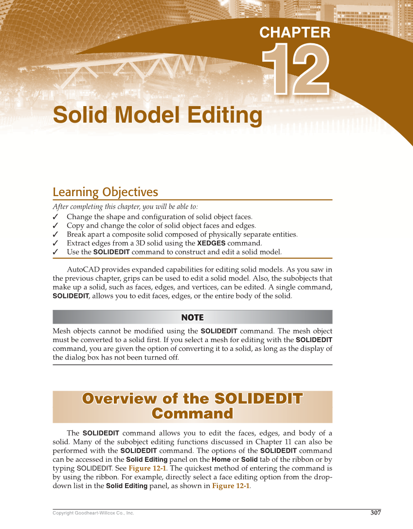307 Copyright Goodheart-Willcox Co., Inc. Learning Objectives After completing this chapter, you will be able to: ✓ Change the shape and confi guration of solid object faces. ✓ Copy and change the color of solid object faces and edges. ✓ Break apart a composite solid composed of physically separate entities. ✓ Extract edges from a 3D solid using the XEDGES command. ✓ Use the SOLIDEDIT command to construct and edit a solid model. AutoCAD provides expanded capabilities for editing solid models. As you saw in the previous chapter, grips can be used to edit a solid model. Also, the subobjects that make up a solid, such as faces, edges, and vertices, can be edited. A single command, SOLIDEDIT, allows you to edit faces, edges, or the entire body of the solid. NOTE NOTE Mesh objects cannot be modifi ed using the SOLIDEDIT command. The mesh object must be converted to a solid fi rst. If you select a mesh for editing with the SOLIDEDIT command, you are given the option of converting it to a solid, as long as the display of the dialog box has not been turned off. Overview of the SOLIDEDIT Overview of the SOLIDEDIT Command Command The SOLIDEDIT command allows you to edit the faces, edges, and body of a solid. Many of the subobject editing functions discussed in Chapter 11 can also be performed with the SOLIDEDIT command. The options of the SOLIDEDIT command can be accessed in the Solid Editing panel on the Home or Solid tab of the ribbon or by typing SOLIDEDIT. See Figure 12-1. The quickest method of entering the command is by using the ribbon. For example, directly select a face editing option from the drop- down list in the Solid Editing panel, as shown in Figure 12-1. Solid Model Editing CHAPTER 12 12
