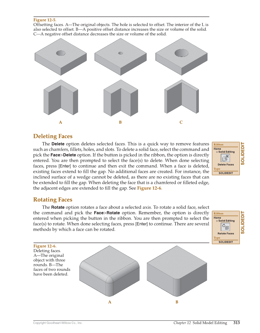Copyright Goodheart-Willcox Co., Inc. Chapter 12 Solid Model Editing 313 Deleting Faces The Delete option deletes selected faces. This is a quick way to remove features such as chamfers, fi llets, holes, and slots. To delete a solid face, select the command and pick the Face Delete option. If the button is picked in the ribbon, the option is directly entered. You are then prompted to select the face(s) to delete. When done selecting faces, press [Enter] to continue and then exit the command. When a face is deleted, existing faces extend to fi ll the gap. No additional faces are created. For instance, the inclined surface of a wedge cannot be deleted, as there are no existing faces that can be extended to fi ll the gap. When deleting the face that is a chamfered or fi lleted edge, the adjacent edges are extended to fi ll the gap. See Figure 12-6. Rotating Faces The Rotate option rotates a face about a selected axis. To rotate a solid face, select the command and pick the Face Rotate option. Remember, the option is directly entered when picking the button in the ribbon. You are then prompted to select the face(s) to rotate. When done selecting faces, press [Enter] to continue. There are several methods by which a face can be rotated. SOLIDEDIT Ribbon Home Solid Editing Delete Faces Type SOLIDEDIT SOLIDEDIT Ribbon Home Solid Editing Rotate Faces Type SOLIDEDIT A B C Figure 12-5. Offsetting faces. A—The original objects. The hole is selected to offset. The interior of the L is also selected to offset. B—A positive offset distance increases the size or volume of the solid. C—A negative offset distance decreases the size or volume of the solid. A B Figure 12-6. Deleting faces. A—The original object with three rounds. B—The faces of two rounds have been deleted.