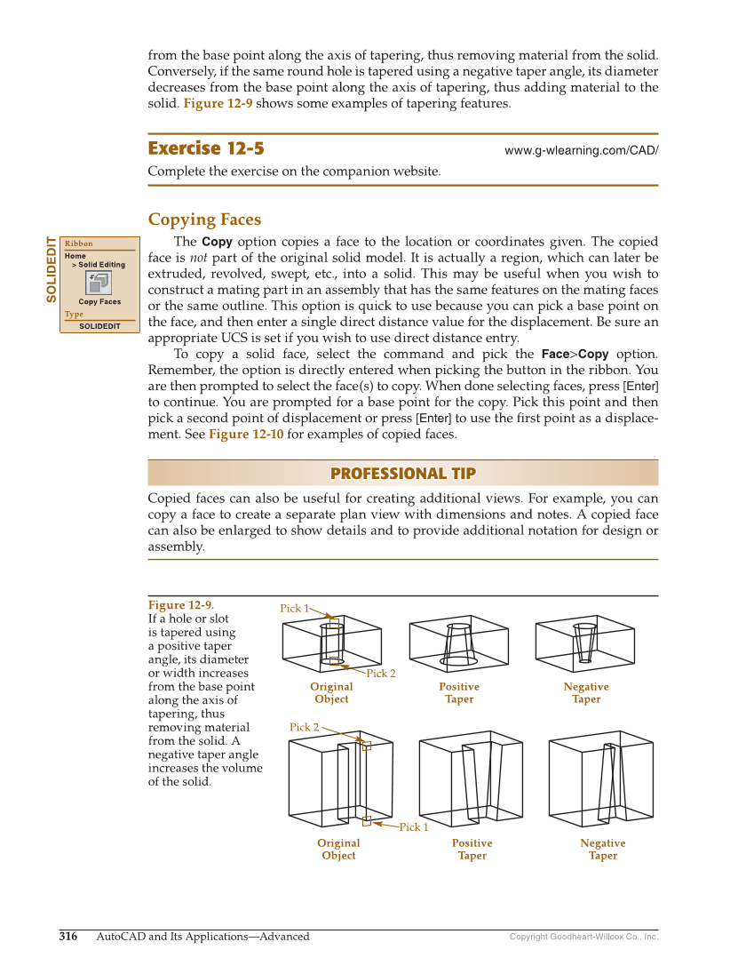 Copyright Goodheart-Willcox Co., Inc. 316 AutoCAD and Its Applications—Advanced from the base point along the axis of tapering, thus removing material from the solid. Conversely, if the same round hole is tapered using a negative taper angle, its diameter decreases from the base point along the axis of tapering, thus adding material to the solid. Figure 12-9 shows some examples of tapering features. Exercise 12-5 www.g-wlearning.com/CAD/ Complete the exercise on the companion website. Copying Faces The Copy option copies a face to the location or coordinates given. The copied face is not part of the original solid model. It is actually a region, which can later be extruded, revolved, swept, etc., into a solid. This may be useful when you wish to construct a mating part in an assembly that has the same features on the mating faces or the same outline. This option is quick to use because you can pick a base point on the face, and then enter a single direct distance value for the displacement. Be sure an appropriate UCS is set if you wish to use direct distance entry. To copy a solid face, select the command and pick the Face Copy option. Remember, the option is directly entered when picking the button in the ribbon. You are then prompted to select the face(s) to copy. When done selecting faces, press [Enter] to continue. You are prompted for a base point for the copy. Pick this point and then pick a second point of displacement or press [Enter] to use the fi rst point as a displace- ment. See Figure 12-10 for examples of copied faces. PROFESSIONAL TIP PROFESSIONAL TIP Copied faces can also be useful for creating additional views. For example, you can copy a face to create a separate plan view with dimensions and notes. A copied face can also be enlarged to show details and to provide additional notation for design or assembly. SOLIDEDIT Ribbon Home Solid Editing Copy Faces Type SOLIDEDIT Pick 1 Pick 2 Pick 2 Pick 1 Original Object Positive Taper Negative Taper Original Object Positive Taper Negative Taper Figure 12-9. If a hole or slot is tapered using a positive taper angle, its diameter or width increases from the base point along the axis of tapering, thus removing material from the solid. A negative taper angle increases the volume of the solid.