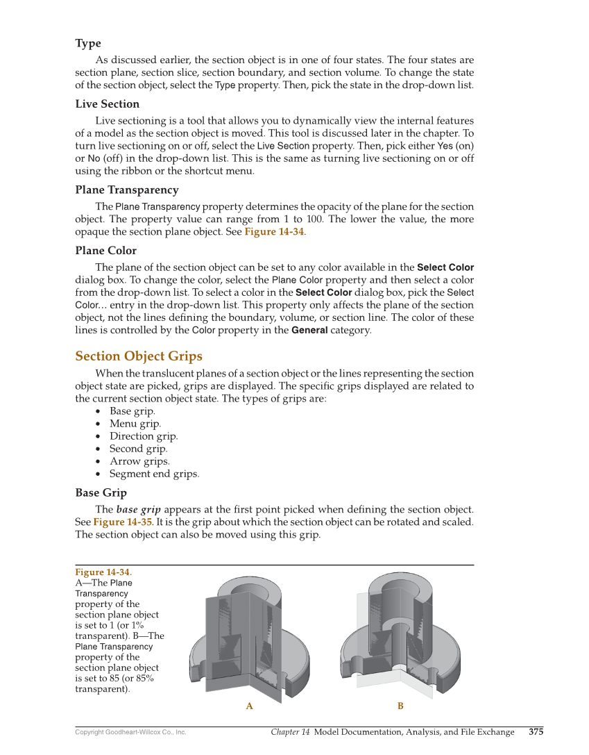 Copyright Goodheart-Willcox Co., Inc. Chapter 14 Model Documentation, Analysis, and File Exchange 375 Type As discussed earlier, the section object is in one of four states. The four states are section plane, section slice, section boundary, and section volume. To change the state of the section object, select the Type property. Then, pick the state in the drop-down list. Live Section Live sectioning is a tool that allows you to dynamically view the internal features of a model as the section object is moved. This tool is discussed later in the chapter. To turn live sectioning on or off, select the Live Section property. Then, pick either Yes (on) or No (off) in the drop-down list. This is the same as turning live sectioning on or off using the ribbon or the shortcut menu. Plane Transparency The Plane Transparency property determines the opacity of the plane for the section object. The property value can range from 1 to 100. The lower the value, the more opaque the section plane object. See Figure 14-34. Plane Color The plane of the section object can be set to any color available in the Select Color dialog box. To change the color, select the Plane Color property and then select a color from the drop-down list. To select a color in the Select Color dialog box, pick the Select Color… entry in the drop-down list. This property only affects the plane of the section object, not the lines defi ning the boundary, volume, or section line. The color of these lines is controlled by the Color property in the General category. Section Object Grips When the translucent planes of a section object or the lines representing the section object state are picked, grips are displayed. The specifi c grips displayed are related to the current section object state. The types of grips are: • Base grip. • Menu grip. • Direction grip. • Second grip. • Arrow grips. • Segment end grips. Base Grip The base grip appears at the fi rst point picked when defi ning the section object. See Figure 14-35. It is the grip about which the section object can be rotated and scaled. The section object can also be moved using this grip. A B Figure 14-34. A—The Plane Transparency property of the section plane object is set to 1 (or 1% transparent). B—The Plane Transparency property of the section plane object is set to 85 (or 85% transparent).