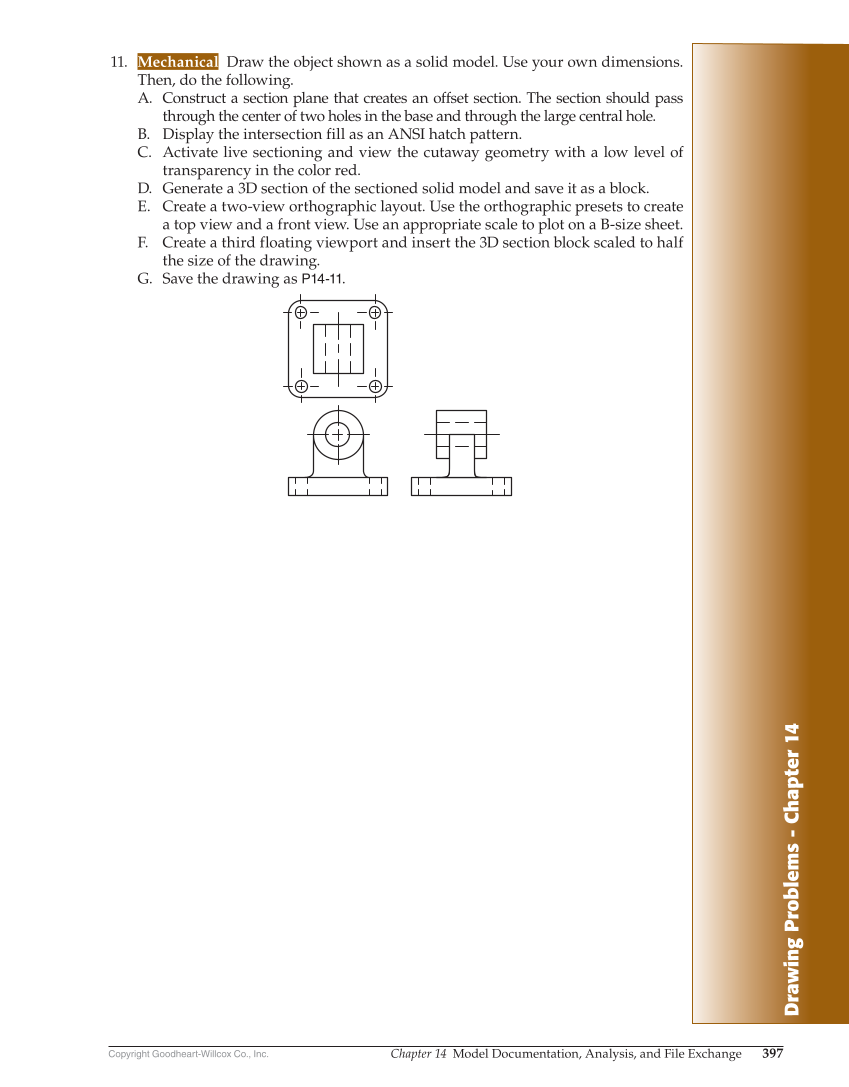 Drawing Problems - Chapter 14 Copyright Goodheart-Willcox Co., Inc. Chapter 14 Model Documentation, Analysis, and File Exchange 397 11. Mechanical Draw the object shown as a solid model. Use your own dimensions. Then, do the following. A. Construct a section plane that creates an offset section. The section should pass through the center of two holes in the base and through the large central hole. B. Display the intersection fill as an ANSI hatch pattern. C. Activate live sectioning and view the cutaway geometry with a low level of transparency in the color red. D. Generate a 3D section of the sectioned solid model and save it as a block. E. Create a two-view orthographic layout. Use the orthographic presets to create a top view and a front view. Use an appropriate scale to plot on a B-size sheet. F. Create a third floating viewport and insert the 3D section block scaled to half the size of the drawing. G. Save the drawing as P14-11.