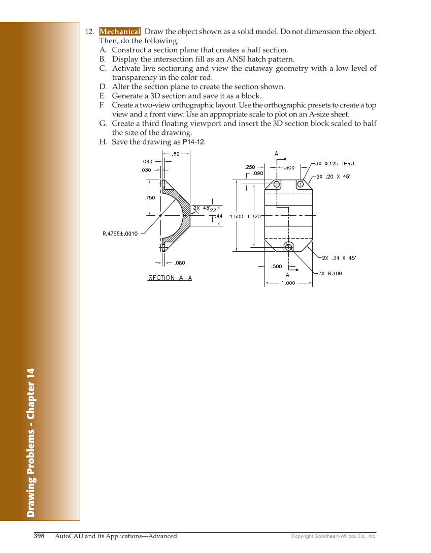 Drawing Problems - Chapter 14 Copyright Goodheart-Willcox Co., Inc. 398 AutoCAD and Its Applications—Advanced 12. Mechanical Draw the object shown as a solid model. Do not dimension the object. Then, do the following. A. Construct a section plane that creates a half section. B. Display the intersection fill as an ANSI hatch pattern. C. Activate live sectioning and view the cutaway geometry with a low level of transparency in the color red. D. Alter the section plane to create the section shown. E. Generate a 3D section and save it as a block. F. Create a two-view orthographic layout. Use the orthographic presets to create a top view and a front view. Use an appropriate scale to plot on an A-size sheet. G. Create a third floating viewport and insert the 3D section block scaled to half the size of the drawing. H. Save the drawing as P14-12.