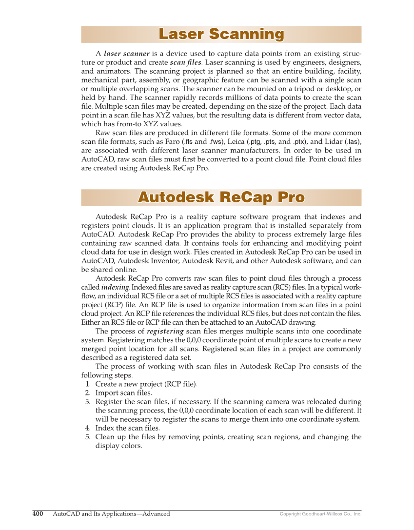 Copyright Goodheart-Willcox Co., Inc. 400 AutoCAD and Its Applications—Advanced Laser Scanning Laser Scanning A laser scanner is a device used to capture data points from an existing struc- ture or product and create scan fi les. Laser scanning is used by engineers, designers, and animators. The scanning project is planned so that an entire building, facility, mechanical part, assembly, or geographic feature can be scanned with a single scan or multiple overlapping scans. The scanner can be mounted on a tripod or desktop, or held by hand. The scanner rapidly records millions of data points to create the scan fi le. Multiple scan fi les may be created, depending on the size of the project. Each data point in a scan fi le has XYZ values, but the resulting data is different from vector data, which has from-to XYZ values. Raw scan fi les are produced in different fi le formats. Some of the more common scan fi le formats, such as Faro (.fls and .fws), Leica (.ptg, .pts, and .ptx), and Lidar (.las), are associated with different laser scanner manufacturers. In order to be used in AutoCAD, raw scan fi les must fi rst be converted to a point cloud fi le. Point cloud fi les are created using Autodesk ReCap Pro. Autodesk ReCap Pro Autodesk ReCap Pro Autodesk ReCap Pro is a reality capture software program that indexes and registers point clouds. It is an application program that is installed separately from AutoCAD. Autodesk ReCap Pro provides the ability to process extremely large fi les containing raw scanned data. It contains tools for enhancing and modifying point cloud data for use in design work. Files created in Autodesk ReCap Pro can be used in AutoCAD, Autodesk Inventor, Autodesk Revit, and other Autodesk software, and can be shared online. Autodesk ReCap Pro converts raw scan fi les to point cloud fi les through a process called indexing. Indexed fi les are saved as reality capture scan (RCS) fi les. In a typical work- fl ow, an individual RCS fi le or a set of multiple RCS fi les is associated with a reality capture project (RCP) fi le. An RCP fi le is used to organize information from scan fi les in a point cloud project. An RCP fi le references the individual RCS fi les, but does not contain the fi les. Either an RCS fi le or RCP fi le can then be attached to an AutoCAD drawing. The process of registering scan fi les merges multiple scans into one coordinate system. Registering matches the 0,0,0 coordinate point of multiple scans to create a new merged point location for all scans. Registered scan fi les in a project are commonly described as a registered data set. The process of working with scan fi les in Autodesk ReCap Pro consists of the following steps. 1. Create a new project (RCP file). 2. Import scan files. 3. Register the scan files, if necessary. If the scanning camera was relocated during the scanning process, the 0,0,0 coordinate location of each scan will be different. It will be necessary to register the scans to merge them into one coordinate system. 4. Index the scan files. 5. Clean up the files by removing points, creating scan regions, and changing the display colors.