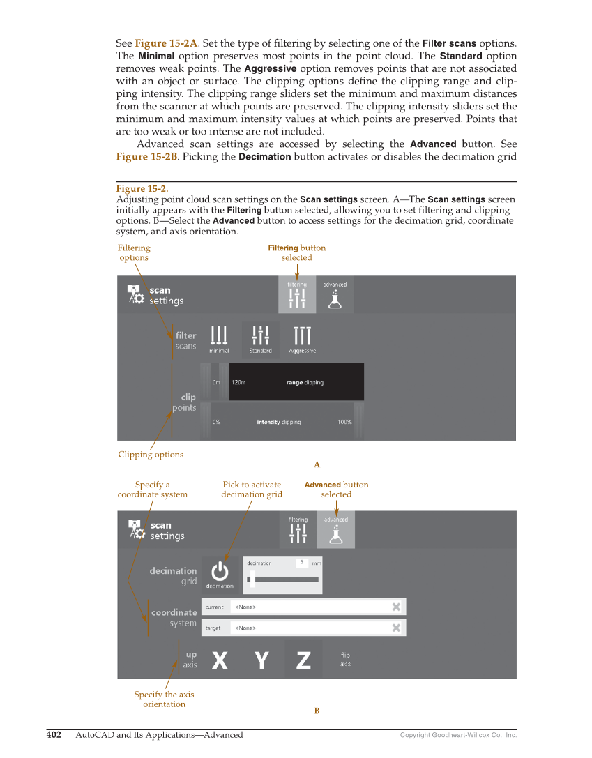 Copyright Goodheart-Willcox Co., Inc. 402 AutoCAD and Its Applications—Advanced See Figure 15-2A. Set the type of fi ltering by selecting one of the Filter scans options. The Minimal option preserves most points in the point cloud. The Standard option removes weak points. The Aggressive option removes points that are not associated with an object or surface. The clipping options defi ne the clipping range and clip- ping intensity. The clipping range sliders set the minimum and maximum distances from the scanner at which points are preserved. The clipping intensity sliders set the minimum and maximum intensity values at which points are preserved. Points that are too weak or too intense are not included. Advanced scan settings are accessed by selecting the Advanced button. See Figure 15-2B. Picking the Decimation button activates or disables the decimation grid Filtering options Clipping options Filtering button selected Advanced button selected Pick to activate decimation grid Specify a coordinate system Specify the axis orientation A B Figure 15-2. Adjusting point cloud scan settings on the Scan settings screen. A—The Scan settings screen initially appears with the Filtering button selected, allowing you to set filtering and clipping options. B—Select the Advanced button to access settings for the decimation grid, coordinate system, and axis orientation.
