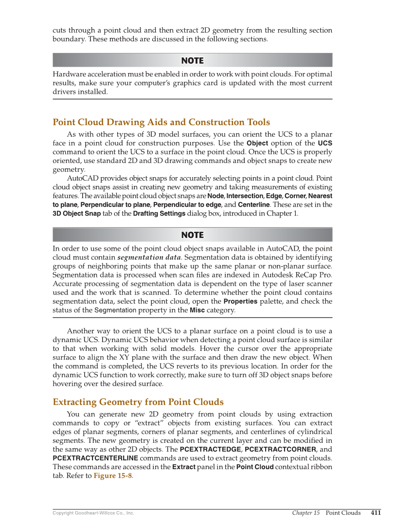 Copyright Goodheart-Willcox Co., Inc. Chapter 15 Point Clouds 411 cuts through a point cloud and then extract 2D geometry from the resulting section boundary. These methods are discussed in the following sections. NOTE NOTE Hardware acceleration must be enabled in order to work with point clouds. For optimal results, make sure your computer’s graphics card is updated with the most current drivers installed. Point Cloud Drawing Aids and Construction Tools As with other types of 3D model surfaces, you can orient the UCS to a planar face in a point cloud for construction purposes. Use the Object option of the UCS command to orient the UCS to a surface in the point cloud. Once the UCS is properly oriented, use standard 2D and 3D drawing commands and object snaps to create new geometry. AutoCAD provides object snaps for accurately selecting points in a point cloud. Point cloud object snaps assist in creating new geometry and taking measurements of existing features. The available point cloud object snaps are Node, Intersection, Edge, Corner, Nearest to plane, Perpendicular to plane, Perpendicular to edge, and Centerline. These are set in the 3D Object Snap tab of the Drafting Settings dialog box, introduced in Chapter 1. NOTE NOTE In order to use some of the point cloud object snaps available in AutoCAD, the point cloud must contain segmentation data. Segmentation data is obtained by identifying groups of neighboring points that make up the same planar or non-planar surface. Segmentation data is processed when scan fi les are indexed in Autodesk ReCap Pro. Accurate processing of segmentation data is dependent on the type of laser scanner used and the work that is scanned. To determine whether the point cloud contains segmentation data, select the point cloud, open the Properties palette, and check the status of the Segmentation property in the Misc category. Another way to orient the UCS to a planar surface on a point cloud is to use a dynamic UCS. Dynamic UCS behavior when detecting a point cloud surface is similar to that when working with solid models. Hover the cursor over the appropriate surface to align the XY plane with the surface and then draw the new object. When the command is completed, the UCS reverts to its previous location. In order for the dynamic UCS function to work correctly, make sure to turn off 3D object snaps before hovering over the desired surface. Extracting Geometry from Point Clouds You can generate new 2D geometry from point clouds by using extraction commands to copy or “extract” objects from existing surfaces. You can extract edges of planar segments, corners of planar segments, and centerlines of cylindrical segments. The new geometry is created on the current layer and can be modifi ed in the same way as other 2D objects. The PCEXTRACTEDGE, PCEXTRACTCORNER, and PCEXTRACTCENTERLINE commands are used to extract geometry from point clouds. These commands are accessed in the Extract panel in the Point Cloud contextual ribbon tab. Refer to Figure 15-8.
