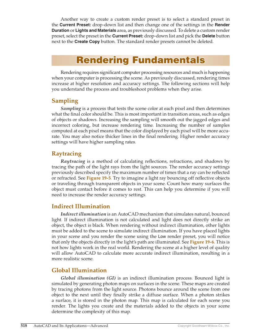 518 AutoCAD and Its Applications—Advanced Copyright Goodheart-Willcox Co., Inc. Another way to create a custom render preset is to select a standard preset in the Current Preset: drop-down list and then change one of the settings in the Render Duration or Lights and Materials area, as previously discussed. To delete a custom render preset, select the preset in the Current Preset: drop-down list and pick the Delete button next to the Create Copy button. The standard render presets cannot be deleted. Rendering Fundamentals Rendering Fundamentals Rendering requires signifi cant computer processing resources and much is happening when your computer is processing the scene. As previously discussed, rendering times increase at higher resolution and accuracy settings. The following sections will help you understand the process and troubleshoot problems when they arise. Sampling Sampling is a process that tests the scene color at each pixel and then determines what the fi nal color should be. This is most important in transition areas, such as edges of objects or shadows. Increasing the sampling will smooth out the jagged edges and incorrect coloring, but increase rendering time. Increasing the number of samples computed at each pixel means that the color displayed by each pixel will be more accu- rate. You may also notice thicker lines in the fi nal rendering. Higher render accuracy settings will have higher sampling rates. Raytracing Raytracing is a method of calculating refl ections, refractions, and shadows by tracing the path of the light rays from the light sources. The render accuracy settings previously described specify the maximum number of times that a ray can be refl ected or refracted. See Figure 19-5. Try to imagine a light ray bouncing off refl ective objects or traveling through transparent objects in your scene. Count how many surfaces the object must contact before it comes to rest. This can help you determine if you will need to increase the render accuracy settings. Indirect Illumination Indirect illumination is an AutoCAD mechanism that simulates natural, bounced light. If indirect illumination is not calculated and light does not directly strike an object, the object is black. When rendering without indirect illumination, other lights must be added to the scene to simulate indirect illumination. If you have placed lights in your scene and you render the scene using the Low render preset, you will notice that only the objects directly in the light’s path are illuminated. See Figure 19-6. This is not how lights work in the real world. Rendering the scene at a higher level of quality will allow AutoCAD to calculate more accurate indirect illumination, resulting in a more realistic scene. Global Illumination Global illumination (GI) is an indirect illumination process. Bounced light is simulated by generating photon maps on surfaces in the scene. These maps are created by tracing photons from the light source. Photons bounce around the scene from one object to the next until they fi nally strike a diffuse surface. When a photon strikes a surface, it is stored in the photon map. This map is calculated for each scene you render. The lights you create and the materials added to the objects in your scene determine the complexity of this map.