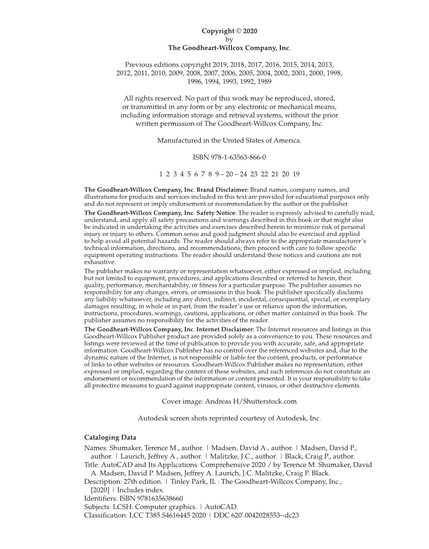 Copyright © 2020 by The Goodheart-Willcox Company, Inc. Previous editions copyright 2019, 2018, 2017, 2016, 2015, 2014, 2013, 2012, 2011, 2010, 2009, 2008, 2007, 2006, 2005, 2004, 2002, 2001, 2000, 1998, 1996, 1994, 1993, 1992, 1989 All rights reserved. No part of this work may be reproduced, stored, or transmitted in any form or by any electronic or mechanical means, including information storage and retrieval systems, without the prior written permission of The Goodheart-Willcox Company, Inc. Manufactured in the United States of America. ISBN 978-1-63563-866-0 1 2 3 4 5 6 7 8 9 – 20 – 24 23 22 21 20 19 The Goodheart-Willcox Company, Inc. Brand Disclaimer: Brand names, company names, and illustrations for products and services included in this text are provided for educational purposes only and do not represent or imply endorsement or recommendation by the author or the publisher. The Goodheart-Willcox Company, Inc. Safety Notice: The reader is expressly advised to carefully read, understand, and apply all safety precautions and warnings described in this book or that might also be indicated in undertaking the activities and exercises described herein to minimize risk of personal injury or injury to others. Common sense and good judgment should also be exercised and applied to help avoid all potential hazards. The reader should always refer to the appropriate manufacturer’s technical information, directions, and recommendations then proceed with care to follow specifi c equipment operating instructions. The reader should understand these notices and cautions are not exhaustive. The publisher makes no warranty or representation whatsoever, either expressed or implied, including but not limited to equipment, procedures, and applications described or referred to herein, their quality, performance, merchantability, or fi tness for a particular purpose. The publisher assumes no responsibility for any changes, errors, or omissions in this book. The publisher specifi cally disclaims any liability whatsoever, including any direct, indirect, incidental, consequential, special, or exemplary damages resulting, in whole or in part, from the reader’s use or reliance upon the information, instructions, procedures, warnings, cautions, applications, or other matter contained in this book. The publisher assumes no responsibility for the activities of the reader. The Goodheart-Willcox Company, Inc. Internet Disclaimer: The Internet resources and listings in this Goodheart-Willcox Publisher product are provided solely as a convenience to you. These resources and listings were reviewed at the time of publication to provide you with accurate, safe, and appropriate information. Goodheart-Willcox Publisher has no control over the referenced websites and, due to the dynamic nature of the Internet, is not responsible or liable for the content, products, or performance of links to other websites or resources. Goodheart-Willcox Publisher makes no representation, either expressed or implied, regarding the content of these websites, and such references do not constitute an endorsement or recommendation of the information or content presented. It is your responsibility to take all protective measures to guard against inappropriate content, viruses, or other destructive elements. Cover image: Andreas H/Shutterstock.com Autodesk screen shots reprinted courtesy of Autodesk, Inc. Cataloging Data Names: Shumaker, Terence M., author. | Madsen, David A., author. | Madsen, David P., author. | Laurich, Jeffrey A., author. | Malitzke, J.C., author. | Black, Craig P., author. Title: AutoCAD and Its Applications: Comprehensive 2020 / by Terence M. Shumaker, David A. Madsen, David P. Madsen, Jeffrey A. Laurich, J.C. Malitzke, Craig P. Black. Description: 27th edition. | Tinley Park, IL : The Goodheart-Willcox Company, Inc., [2020] | Includes index. Identifi ers: ISBN 9781635638660 Subjects: LCSH: Computer graphics. | AutoCAD. Classifi cation: LCC T385.S4616445 2020 | DDC 620'.0042028553--dc23